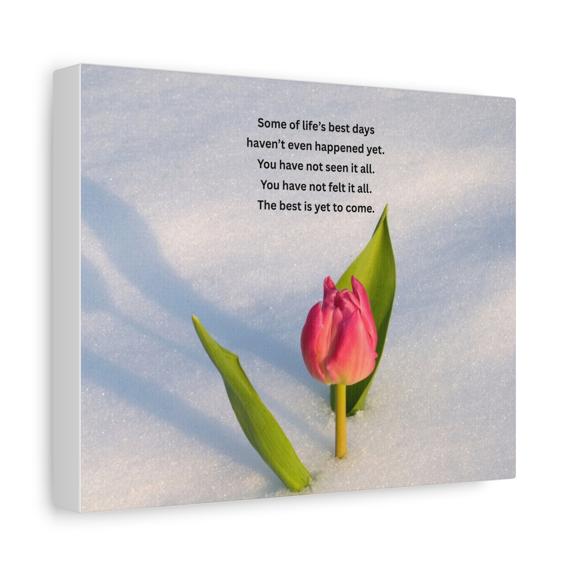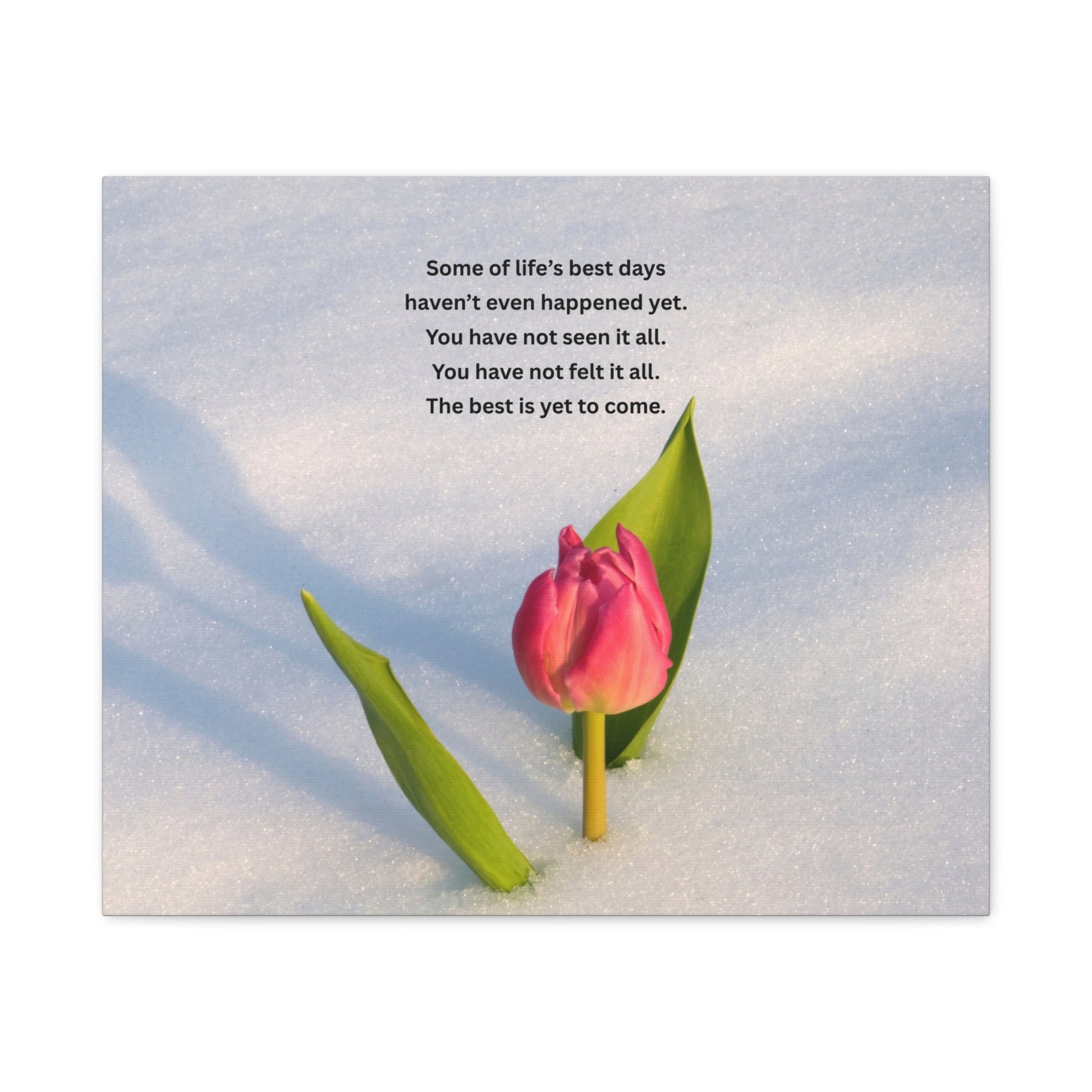 A matte stretched canvas that captures a quiet, hopeful moment — a single pink tulip pushing through fresh snow beneath a short, uplifting verse. The soft matte finish mutes glare and gives depth to the photograph, while the 1.25" profile provides a substantial edge that sits confidently on the wall. This piece brings a gentle, reflective presence to bedrooms, entryways, or cozy corners where someone might pause and breathe. It reads like a small, visual reminder that new beginnings arrive slowly but surely.