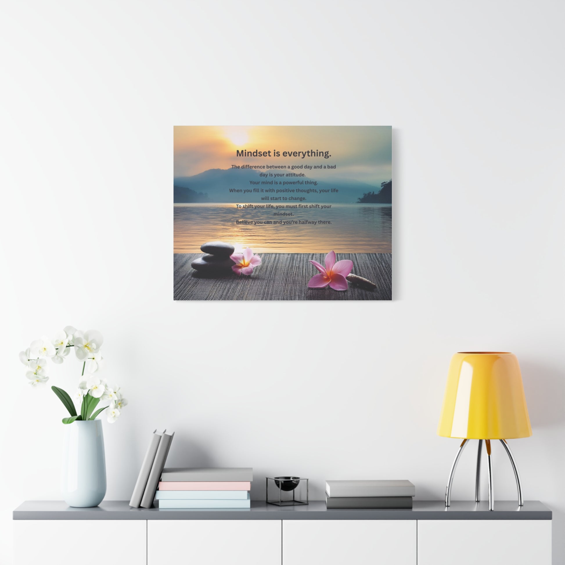 Soft light warms a quiet lakeshore at sunrise. Smooth stones and delicate plumeria rest on weathered decking while distant misty hills fade into gold — a calm moment captured on matte canvas. The subtle, inspirational text “Mindset is everything.” sits gently over the scene, inviting a slow breath and a reset. Hung above a bedside table, in a meditation corner, or near a home office, this stretched canvas settles the room and nudges the day toward intention. The muted palette and textured matte finish keep reflections low and make the words feel personal, not shouted. Each piece arrives stretched on sustainably sourced pine with small rubber feet on the back so it hangs true and rests quietly against the wall.