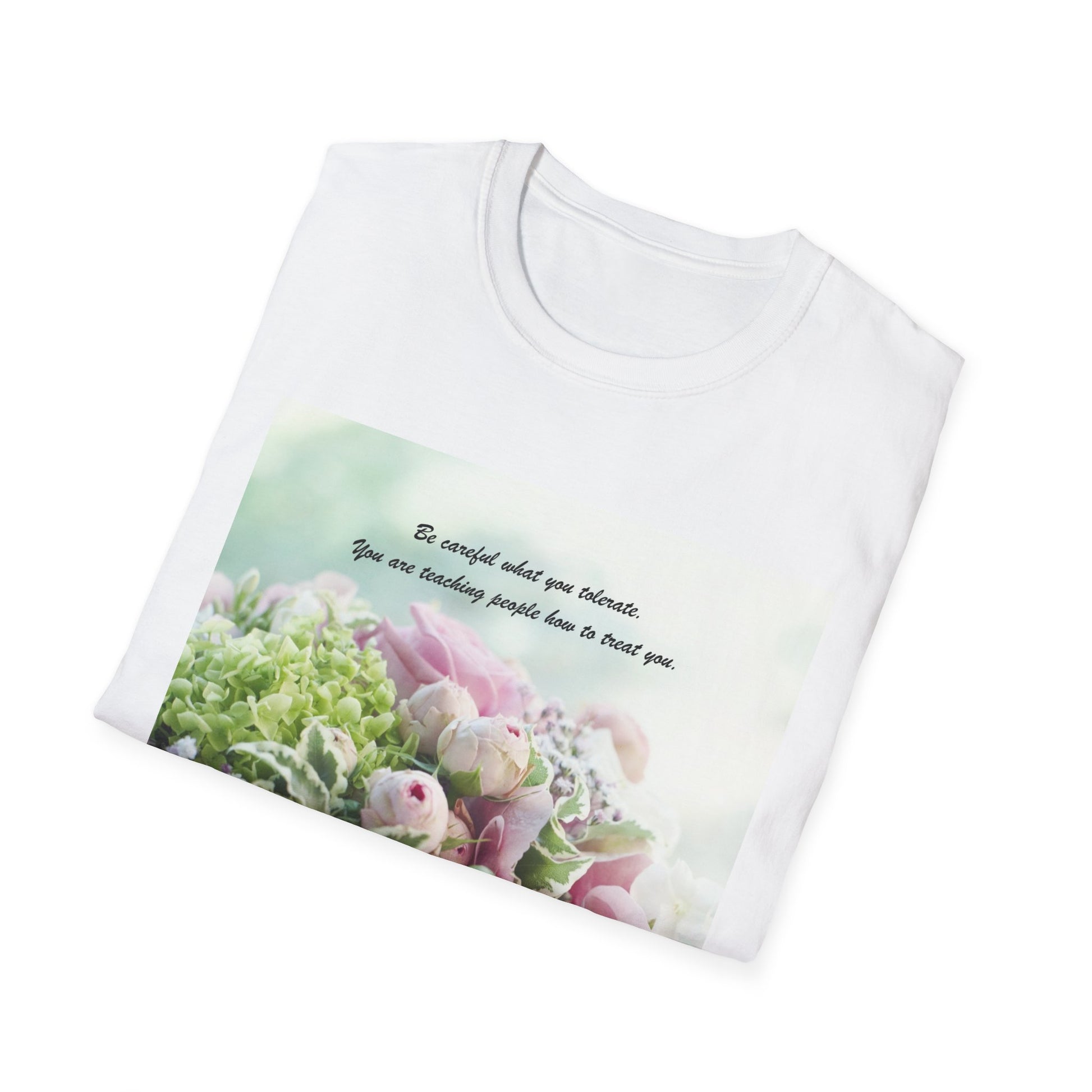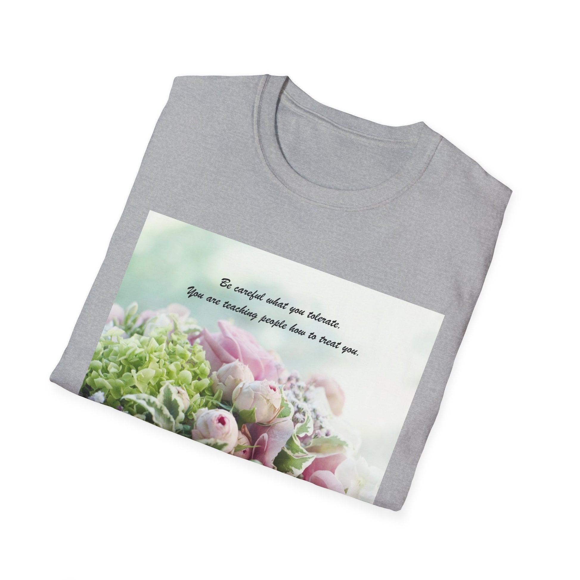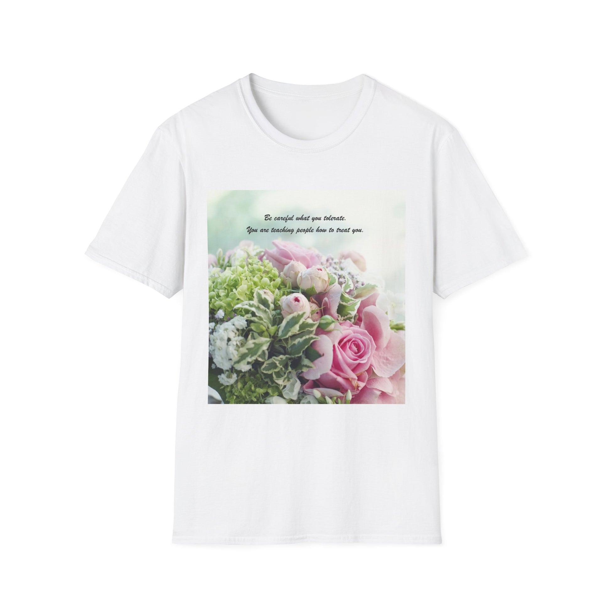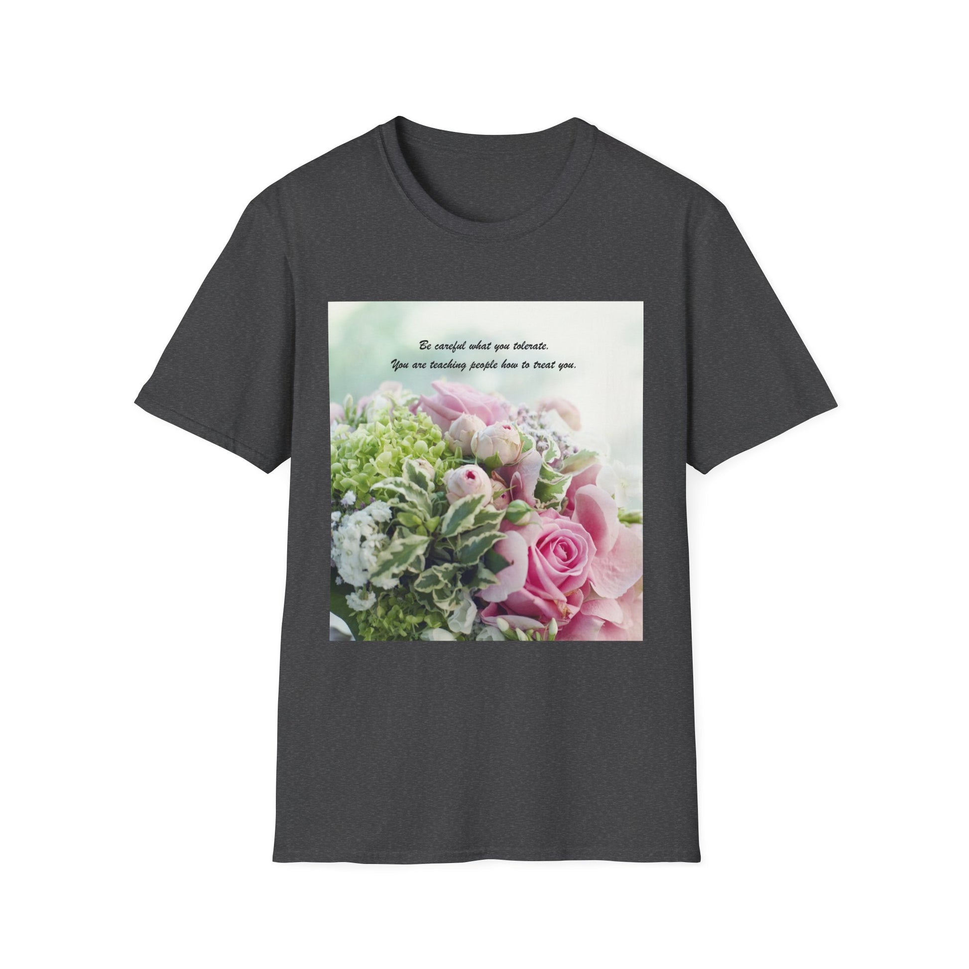 A soft, lightweight cotton tee printed with a gentle bouquet image and a short, heartfelt line. The pastel roses and greenery sit inside a soft-focus square, giving the shirt a calm, intimate look — like wearing a quiet moment from a handwritten note. It drapes easily, holds its shape, and feels breathable against the skin. Wear it when you want something understated that still says you notice small, tender things.