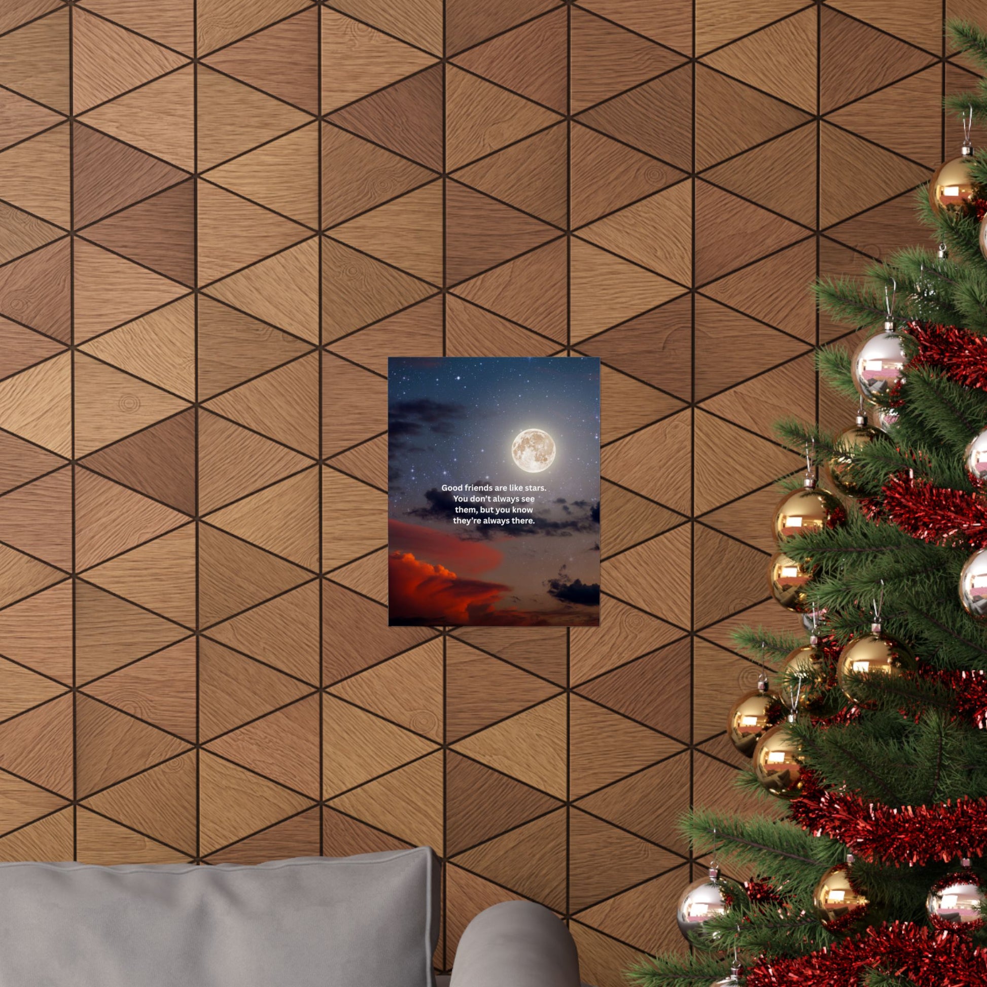 A matte vertical poster that captures the quiet warmth of friendship beneath a moonlit sky. The design blends a luminous full moon, scattered stars, and soft, amber clouds to create a gentle, contemplative scene. Centered text reads: “Good friends are like stars. You don’t always see them, but you know they’re always there,” giving the piece an intimate, heartfelt voice. Printed with museum-grade archival paper and giclée inks, the image holds rich, fade-resistant color while the matte finish soaks up glare for a soft, gallery-quality look. Hang it in a reading nook, hallway, or bedroom to add a calm, reassuring presence that feels like a quiet conversation with someone who cares.