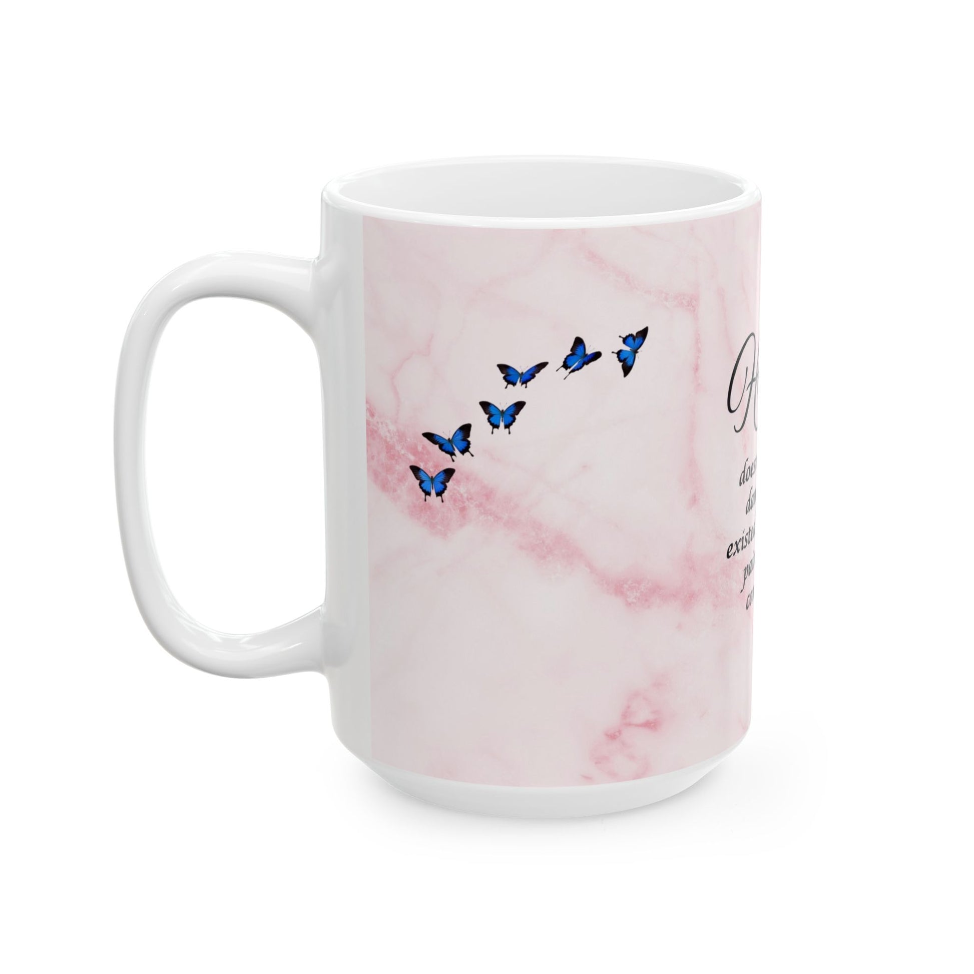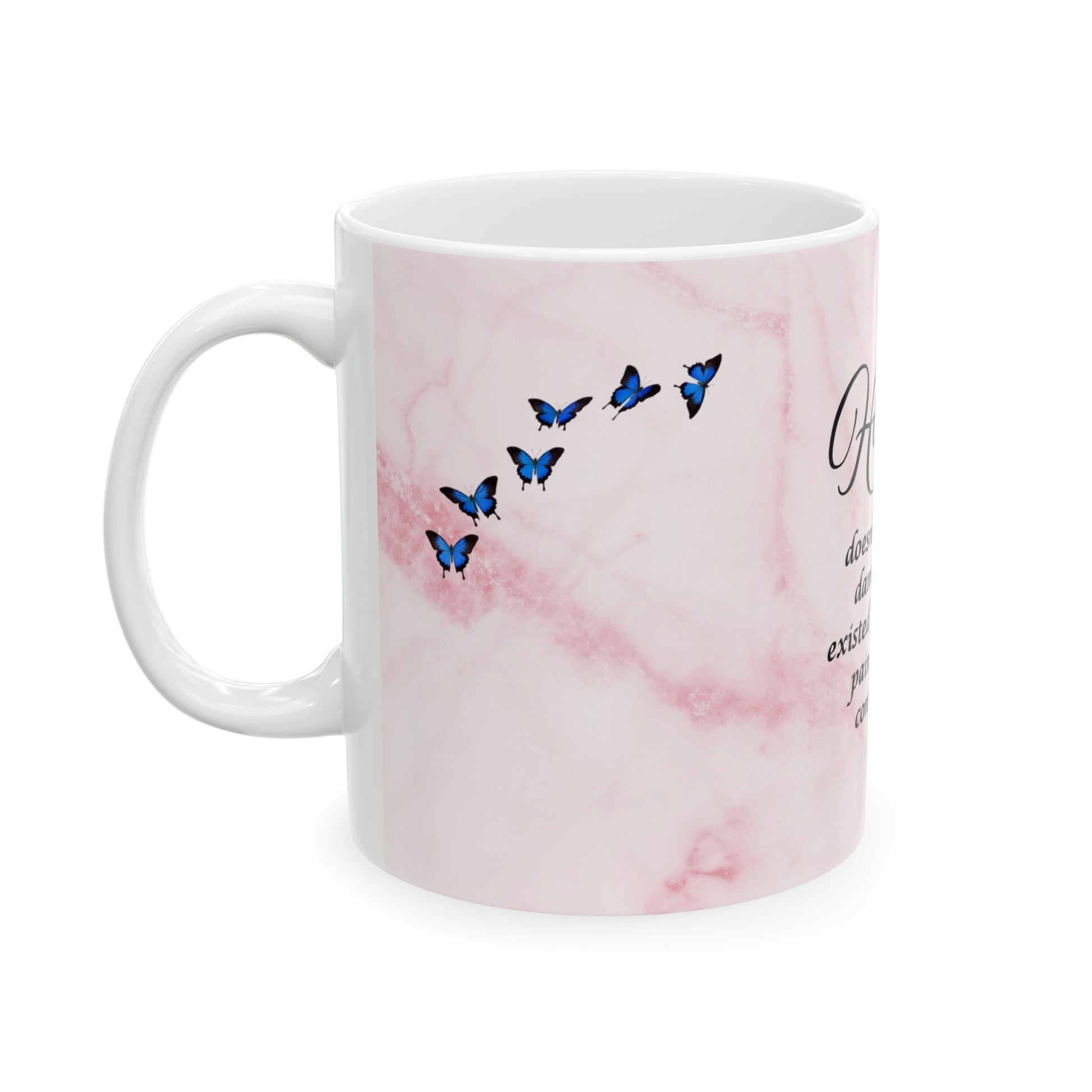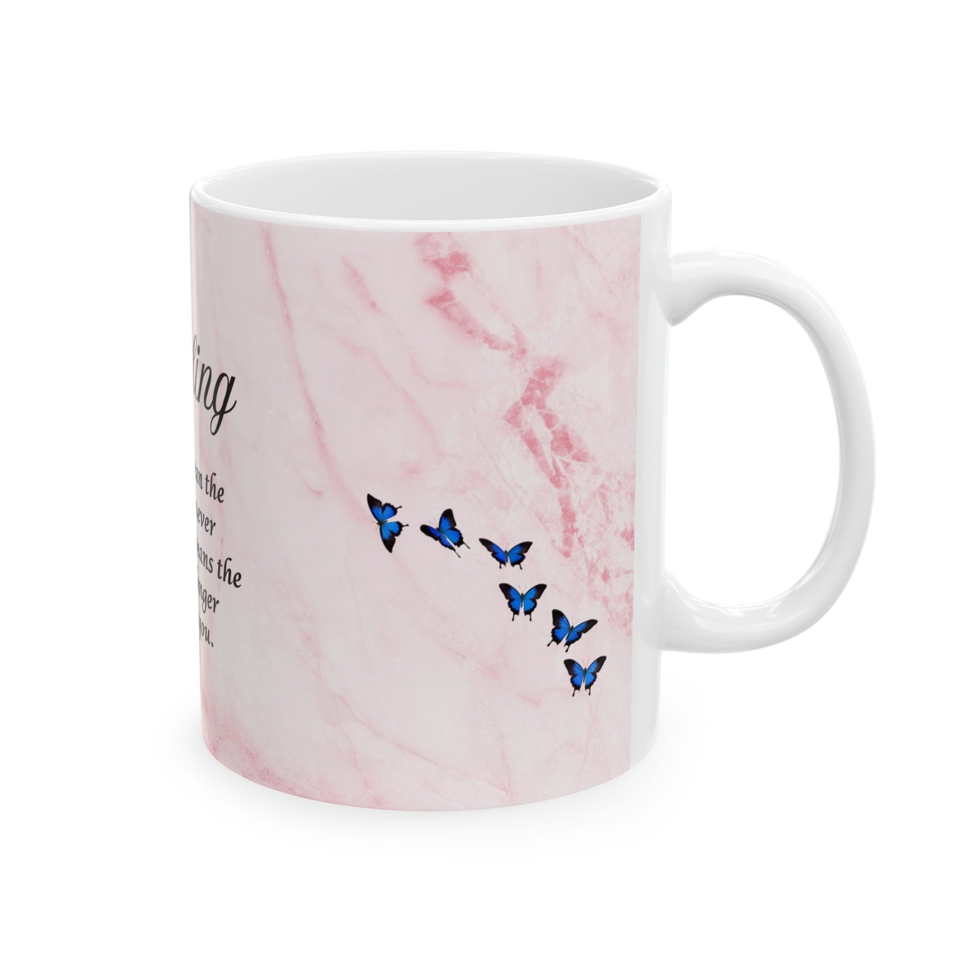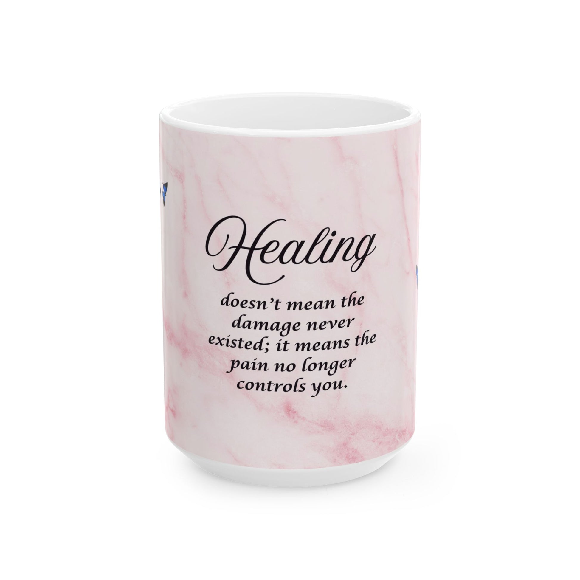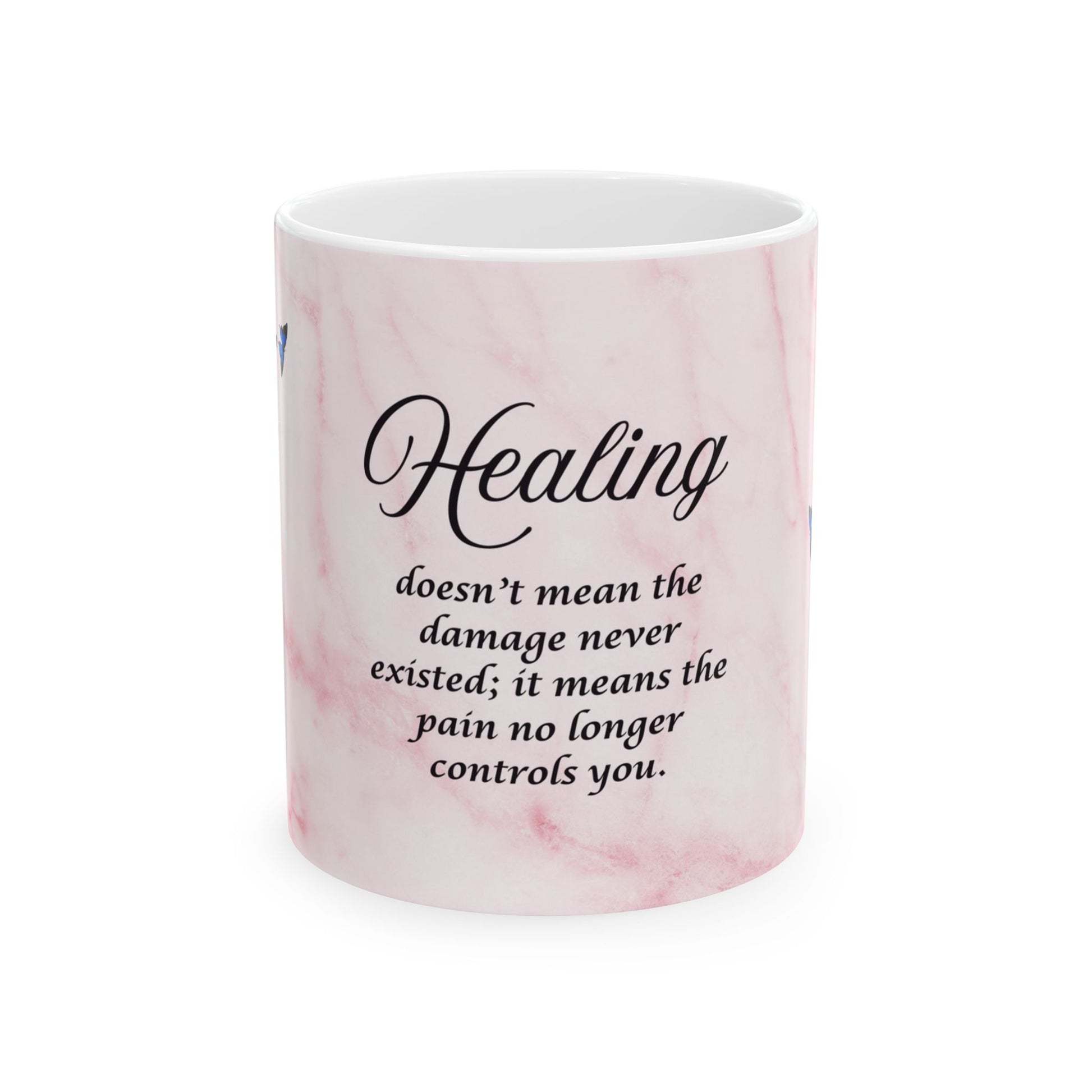 Warm and gentle, this ceramic mug carries a quiet message of recovery and resilience. Soft pink marbling wraps around the cup while a graceful script reads: “Healing doesn’t mean the damage never existed; it means the pain no longer controls you.” Small navy butterflies lift off the background, adding a delicate, hopeful touch. Use it to hold morning coffee, evening tea, or a steadying hot cocoa during moments when you need a reminder that progress matters. The glossy finish makes the colors sing, and the sturdy C-handle keeps it easy to hold during slow, reflective sips.