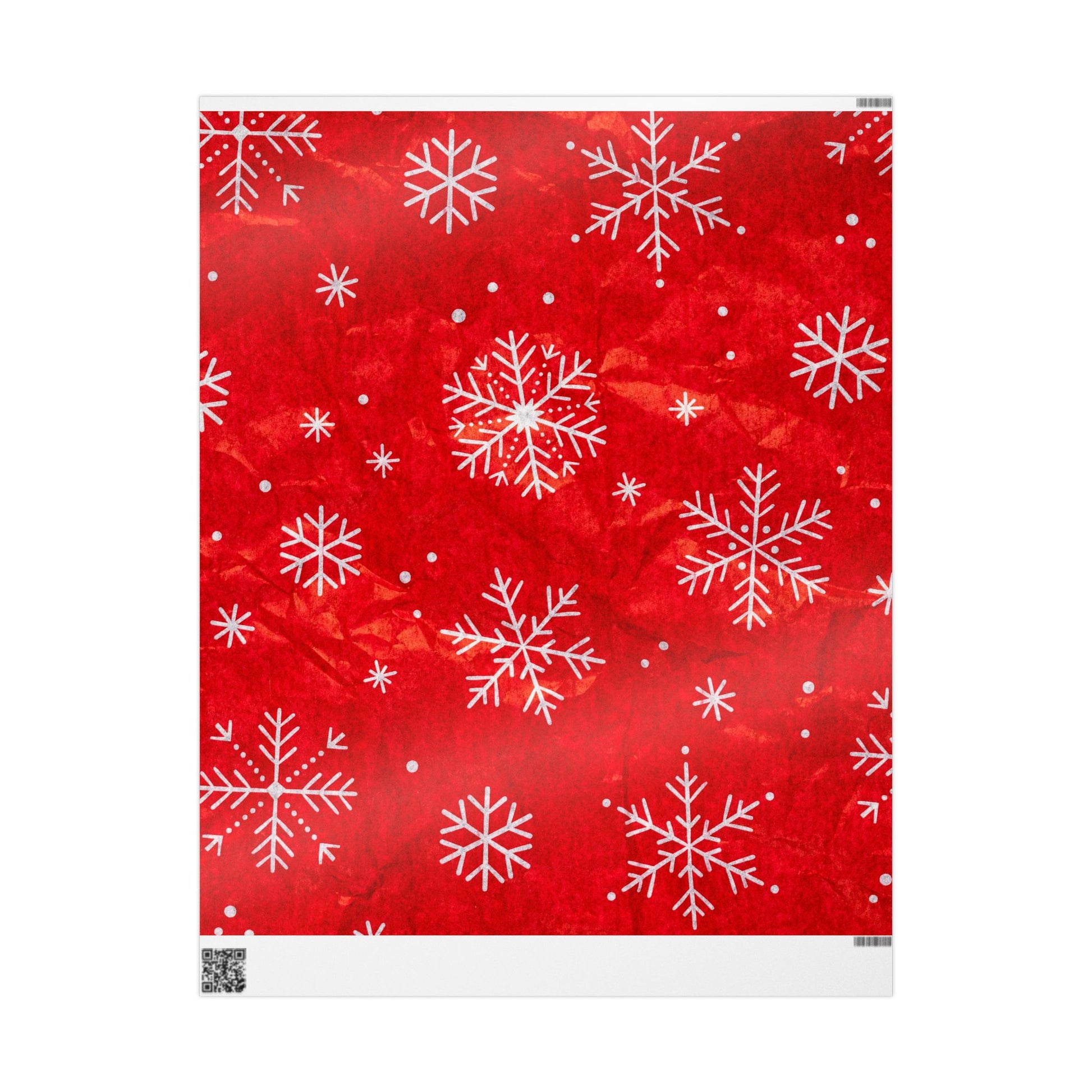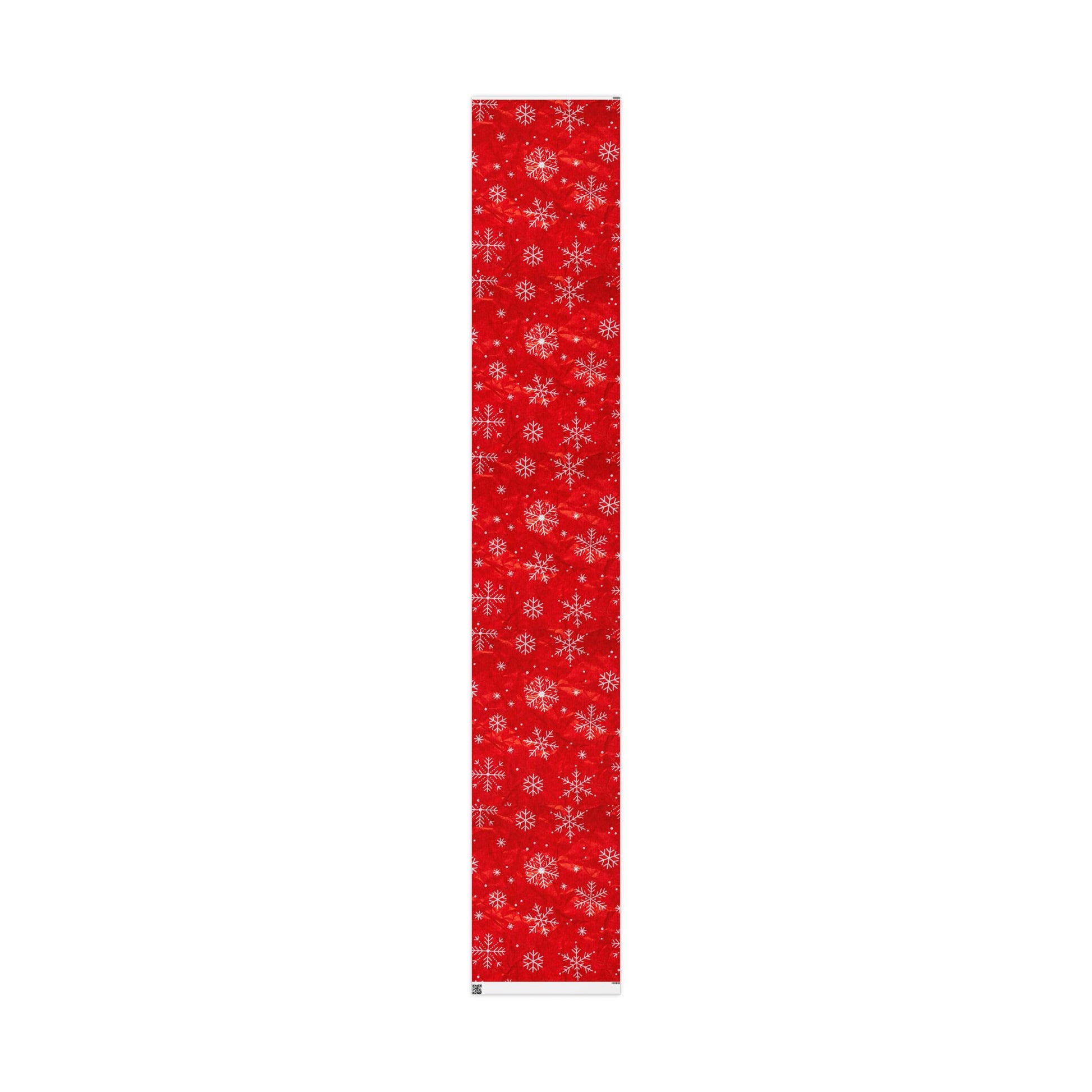 A rich, festive red wrapping paper printed on 90gsm fine art stock that brings a nostalgic snowfall to holiday packages. The design shows delicate white snowflakes scattered across a deep crimson background, with a slight texture that reads like brushed paper when unfolded. Choose glossy for a bright, reflective finish that makes the reds pop, or matte for a softer, handcrafted look. It comes one-sided and in three generous lengths to cover small boxes or long, narrow parcels. The subtle white trim with a QR code appears at the roll edges as part of production.
