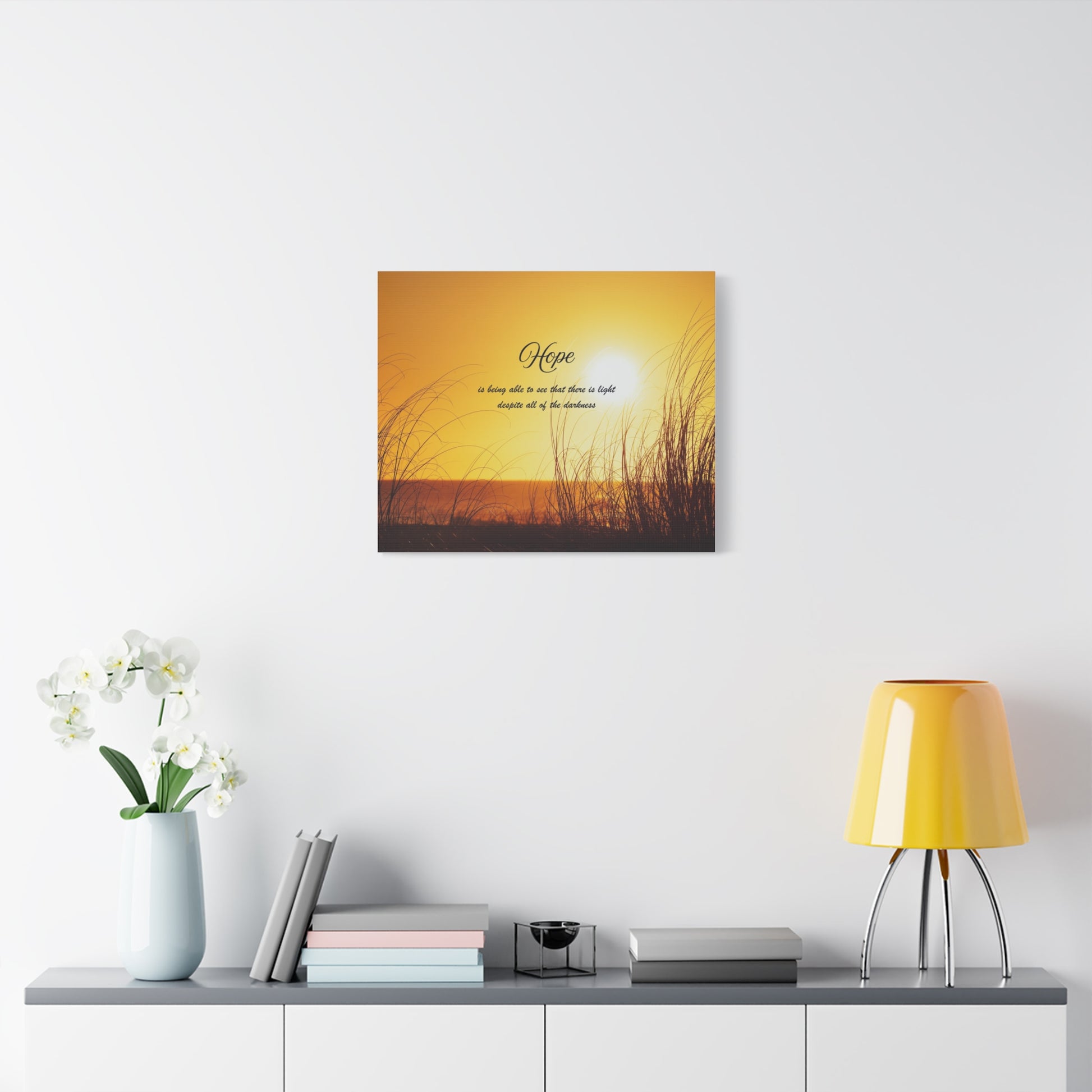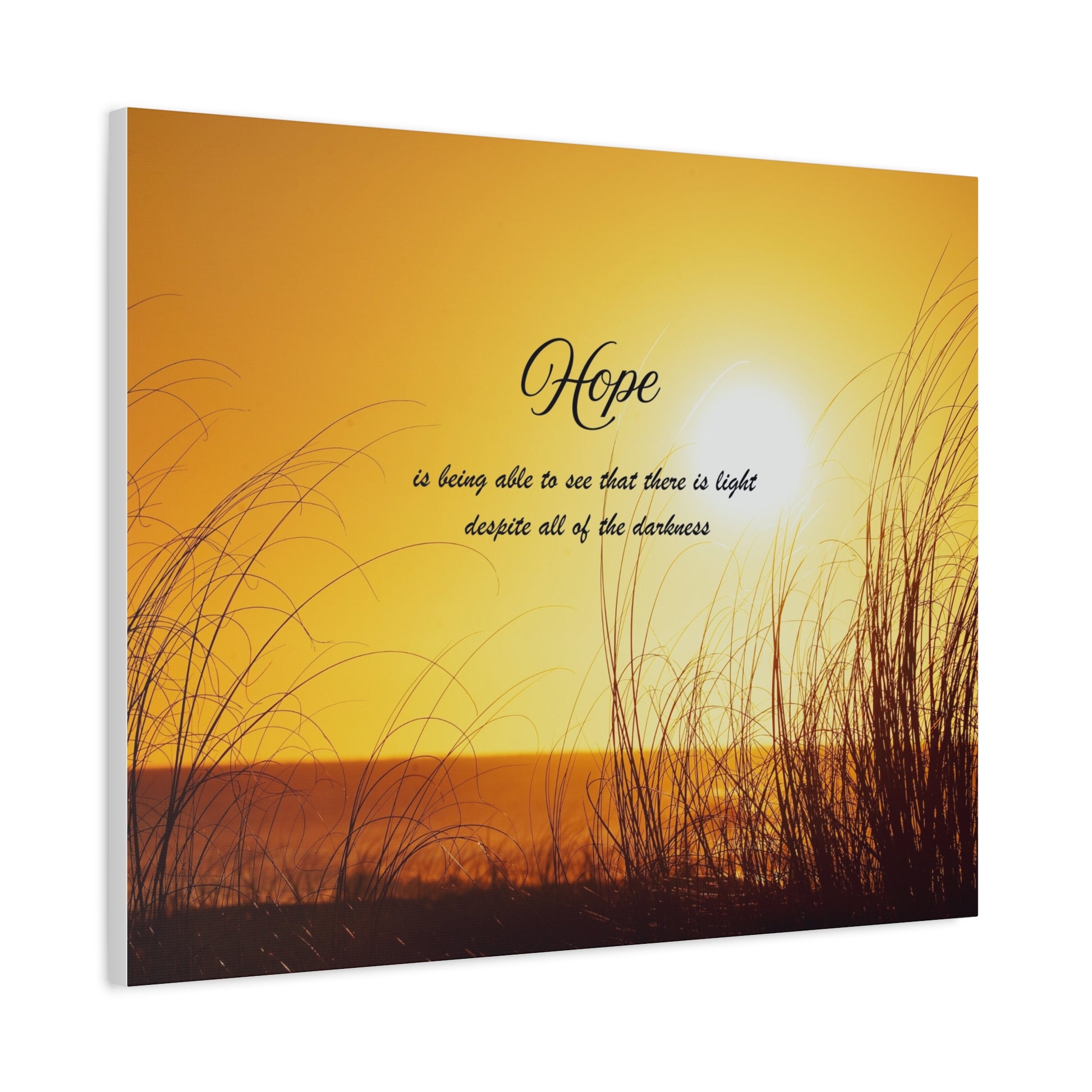 Golden light spills across a quiet shoreline, tall dune grasses bowing in silhouette as the sun climbs. The word “Hope” sits gently in the sky, followed by a short, tender sentence about finding light in darkness. This stretched matte canvas brings a moment of calm and quiet encouragement into a room—warm, subtle, and resilient. The soft matte finish keeps glare low so the warmth of the image reads like a memory rather than a photograph. Lightweight but sturdy, it arrives ready to hang and settle into a bedroom, reading nook, or hallway where people stop, breathe, and feel steadier.