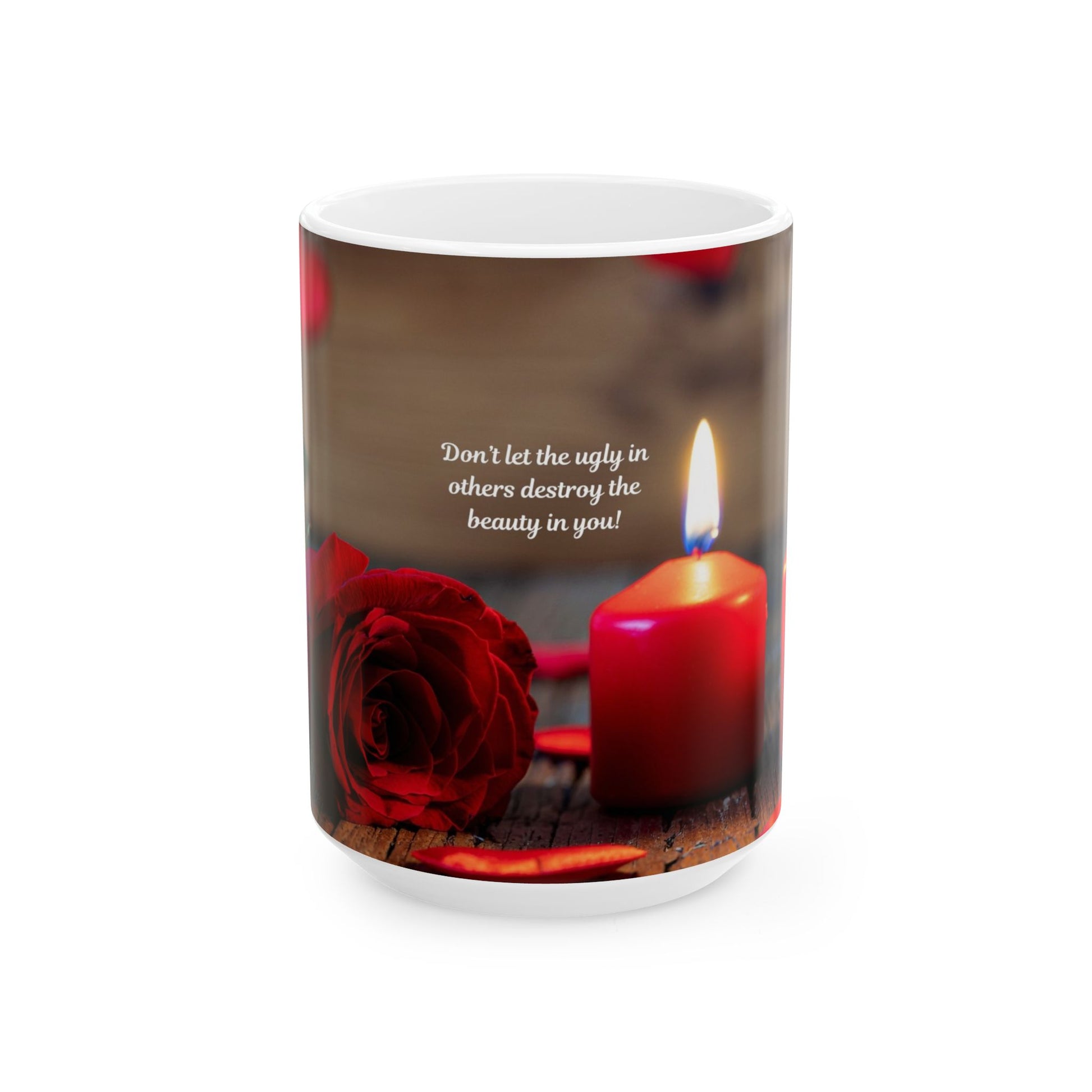 Inspirational Candle & Rose Ceramic Mug — "Don't let the ugly in others destroy the beauty in you" (11oz/15oz)