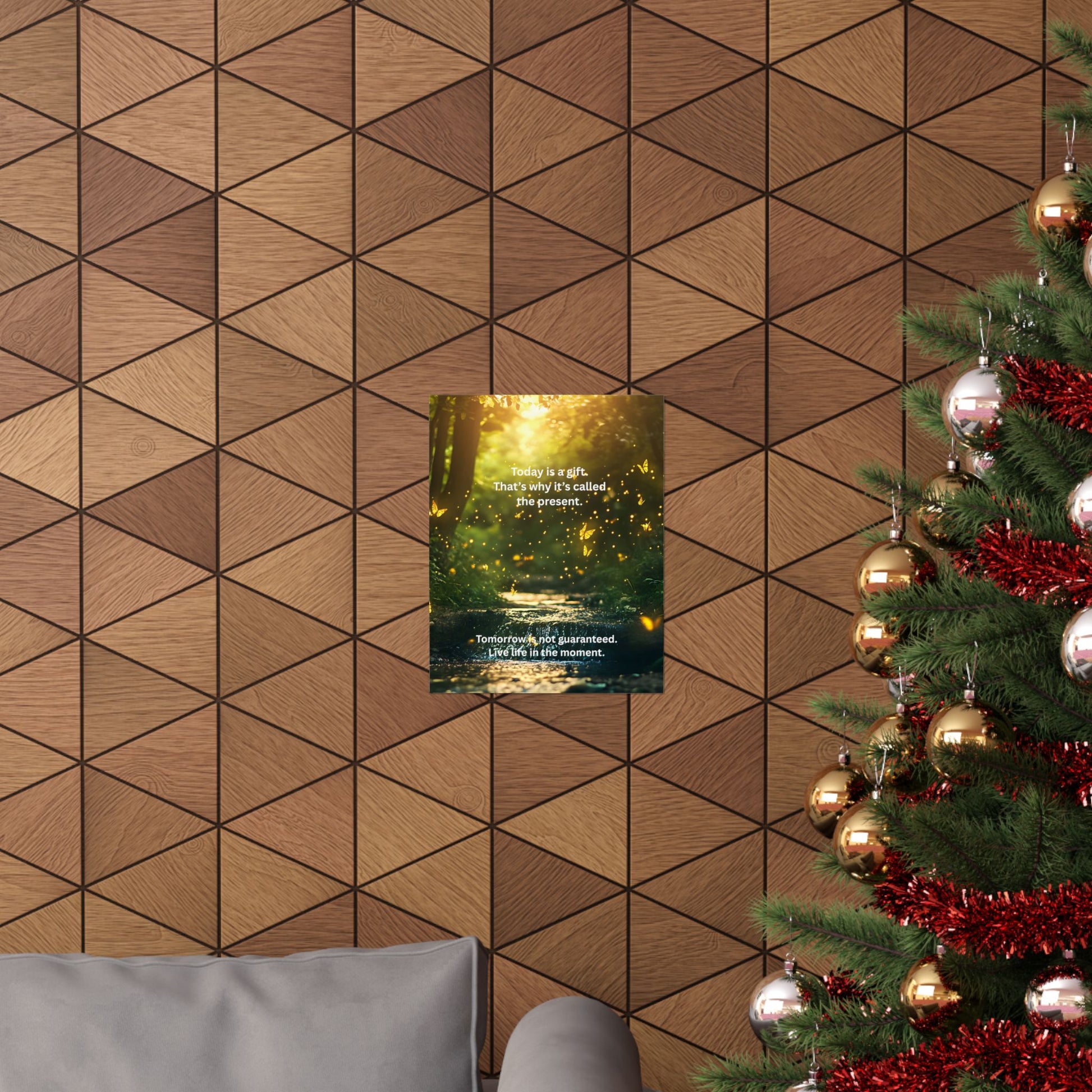 Soft sunlight filters through a quiet summer wood, fireflies drifting above a shallow stream. Centered text reads a gentle reminder to savor the present: “Today is a gift. That’s why it’s called the present.” This matte vertical poster brings a moment of calm to a hallway, bedside wall, or home office — a visual pause that nudges you back to the breath and the small, golden things around you. Printed on archival museum-grade paper with giclée inks, the colors stay vivid while the matte finish keeps glare low, so the scene reads beautifully from morning light to lamplight. Available in many sizes for a subtle, framed touch that blends with rustic, minimalist, or bohemian interiors. Intended for indoor display and built to last as a keepsake reminder to live in the moment.