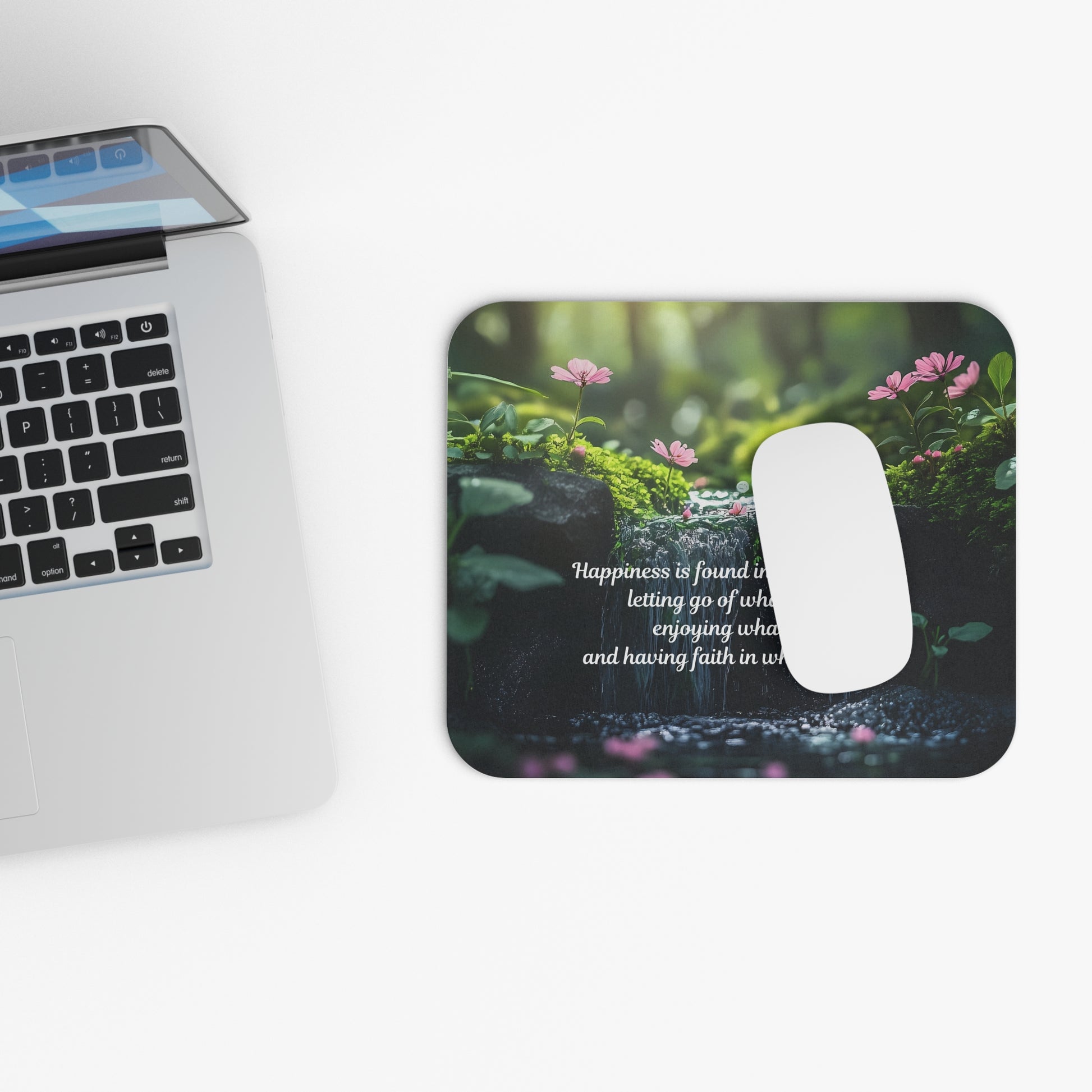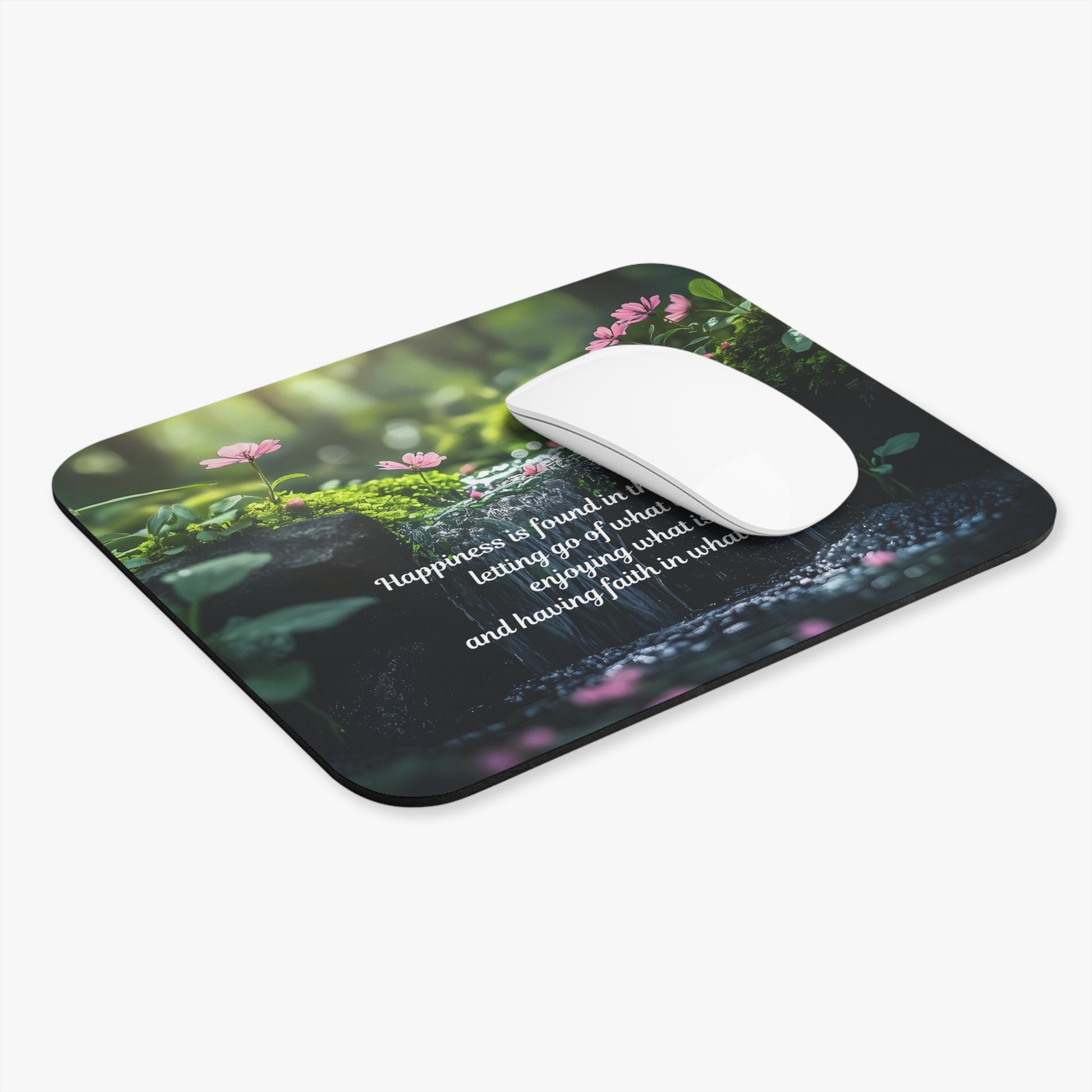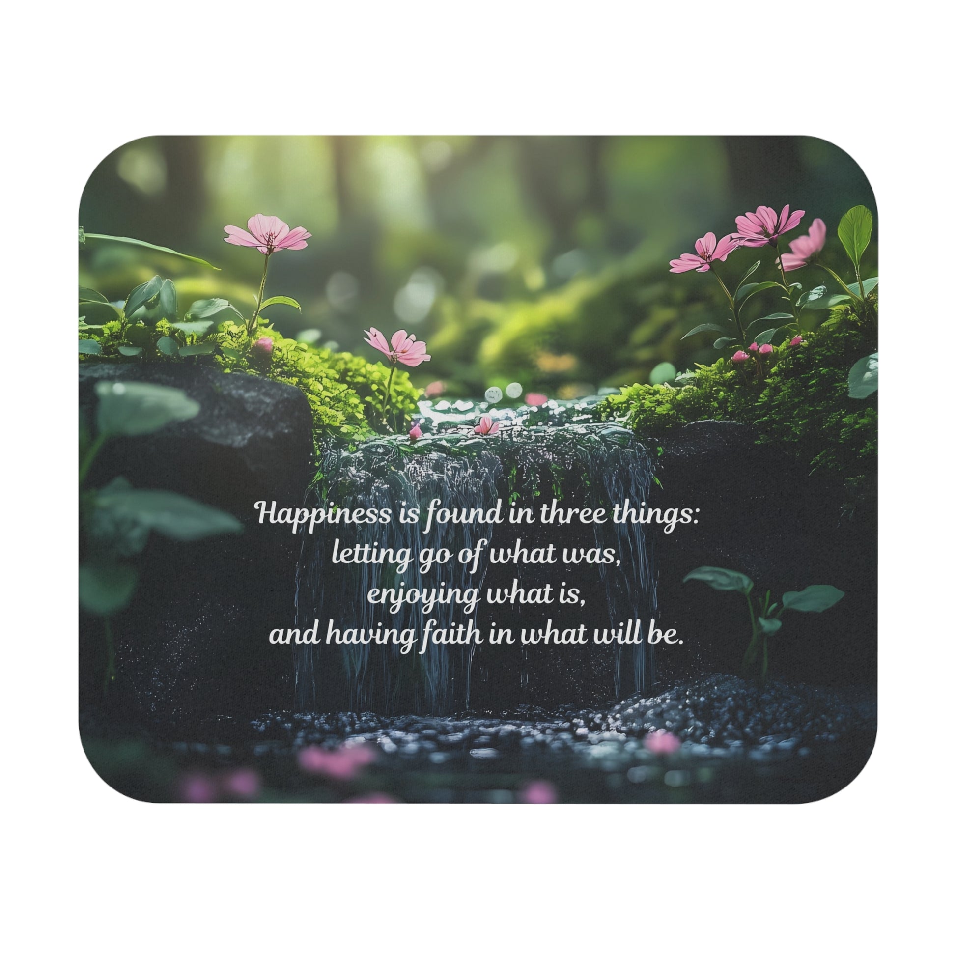 Soft morning light filters through moss and tiny wildflowers on this rectangular mouse pad, carrying a gentle reminder set in elegant script: “Happiness is found in three things: letting go of what was, enjoying what is, and having faith in what will be.” The image brings a calm, forest-floor atmosphere to your desk — quiet green tones, delicate pink blossoms, and the subtle texture of damp stones. The low profile and smooth surface make everyday mousing feel effortless, while the vibrant full-front print keeps the quote and imagery crisp. Place it beside your laptop or monitor to create a small, grounding moment during busy days or to complement a nature-inspired workspace.