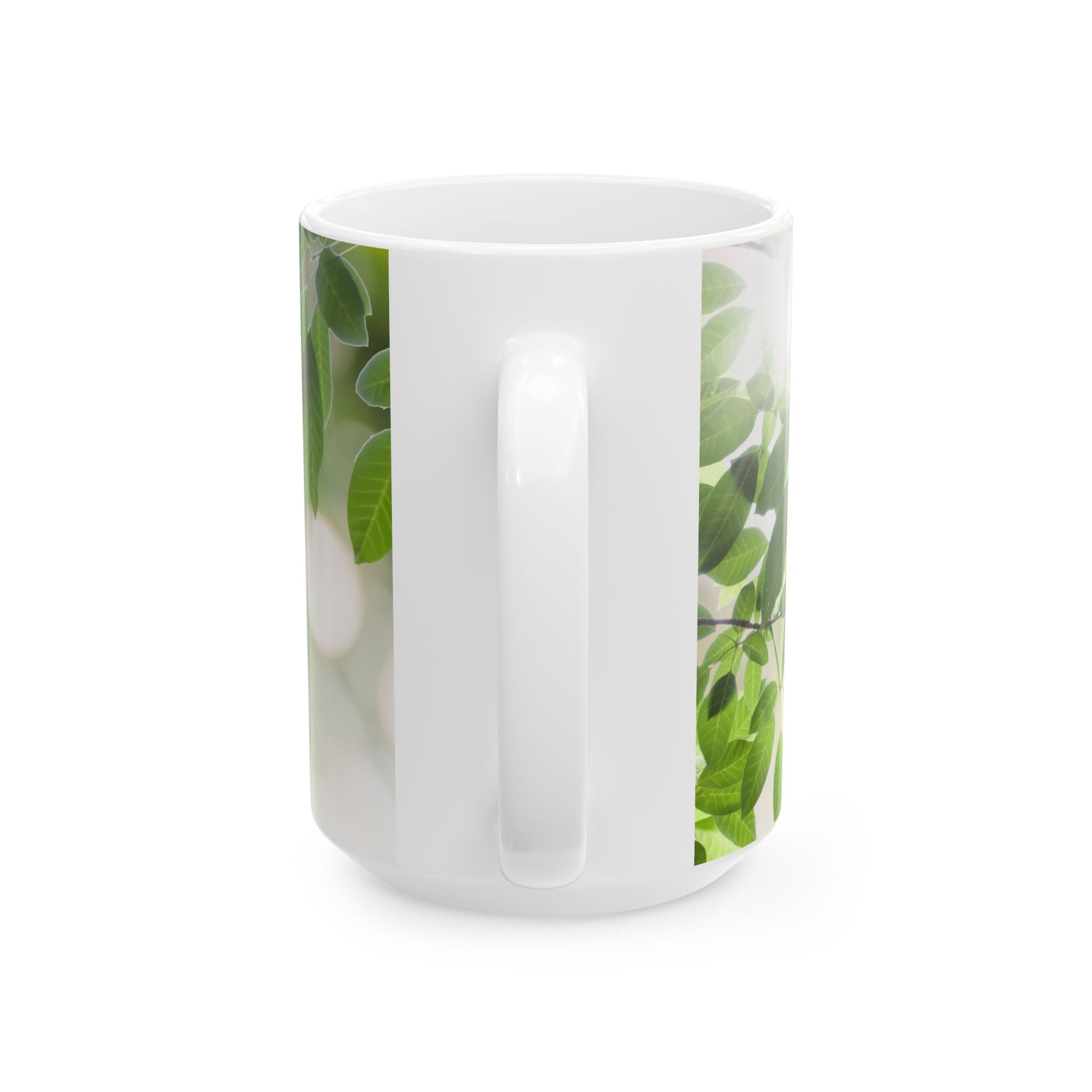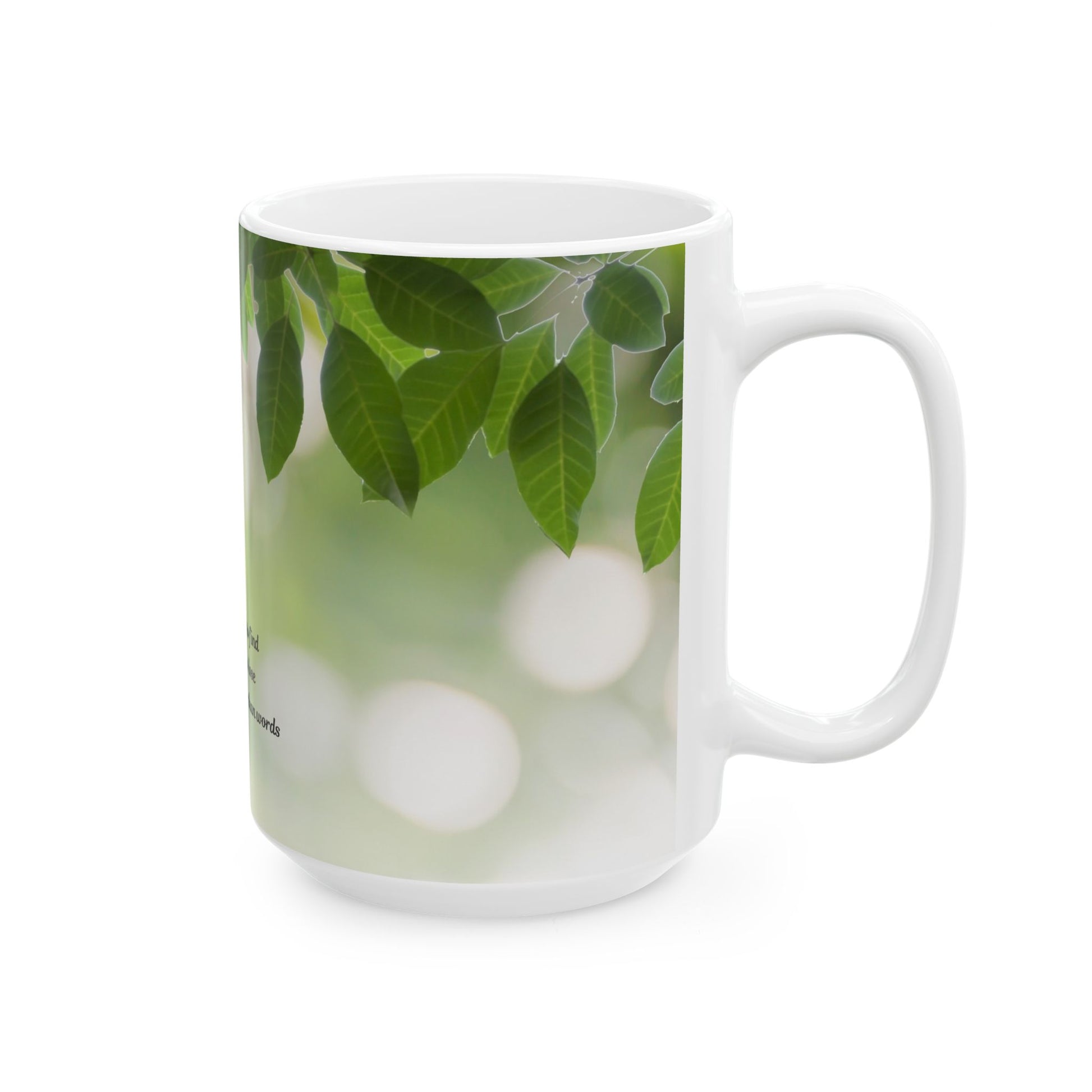 Sip slowly and let morning light filter through leafy green branches. This ceramic mug wraps a soft bokeh of sunlit leaves around your hands, with a gentle, understated quote nestled among the foliage. It feels like a quiet garden moment — steady, hopeful, and real. Reach for it when you need calm before the day starts, during slow afternoons between tasks, or as a companion to heartfelt conversations. The glossy white base makes the colors sing while the comfortable C-handle keeps each hold familiar and warm.