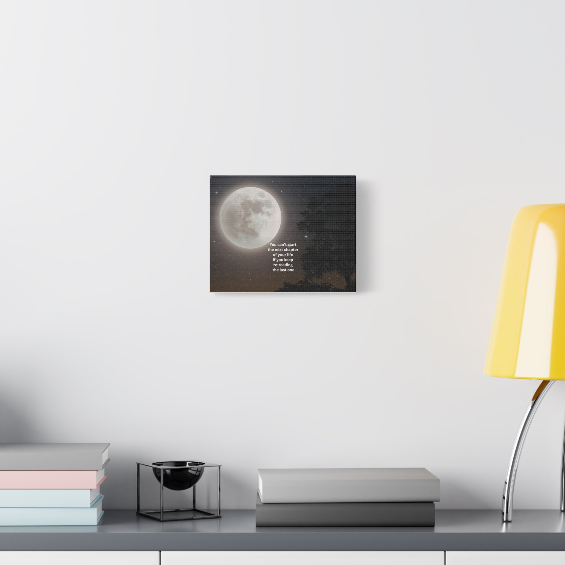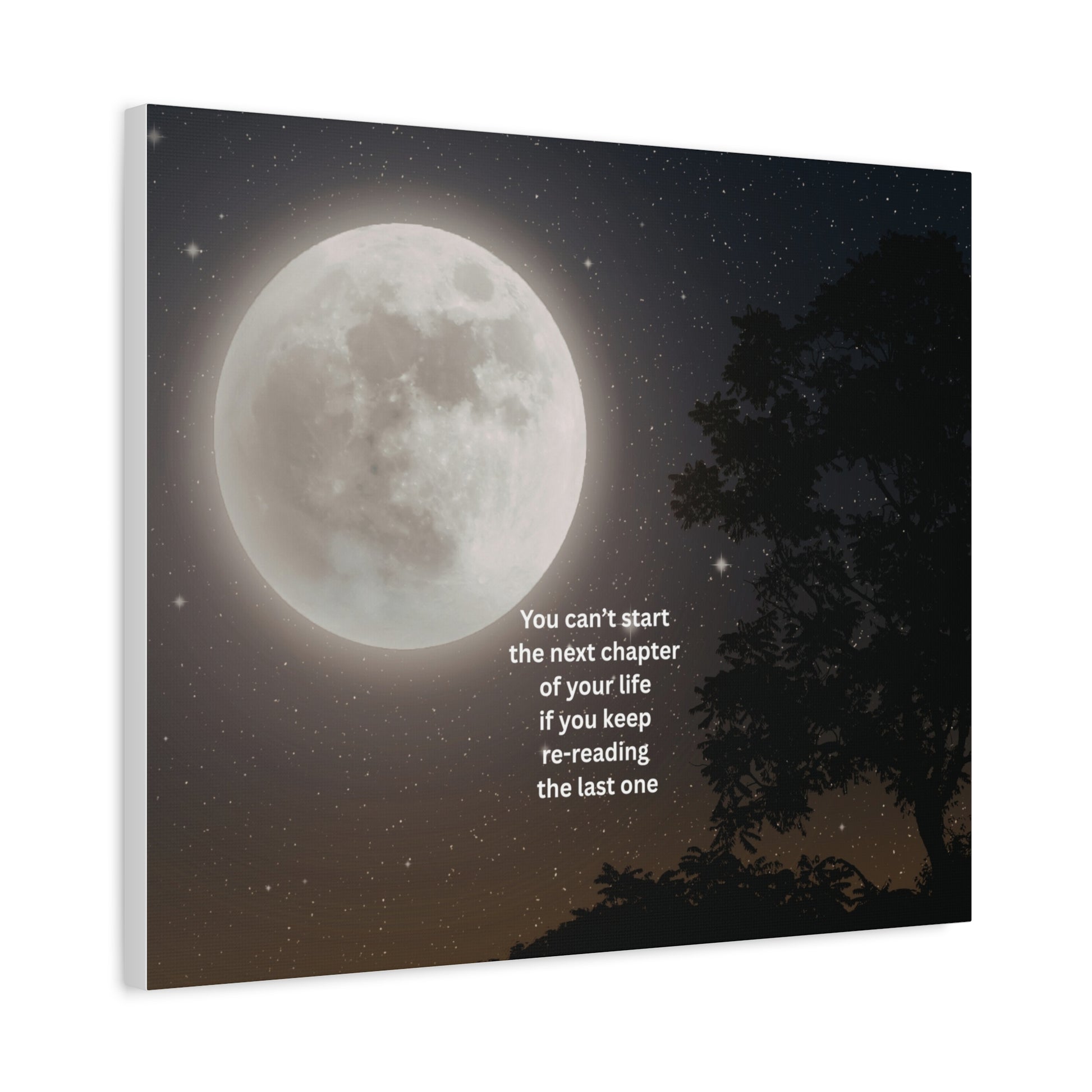 A matte stretched canvas that brings a quiet, reflective moment into any room. The print captures a luminous full moon against a star-flecked night sky, framed by the silhouette of tree branches. A small, hopeful line of text sits near the moon: “You can't start the next chapter of your life if you keep re-reading the last one,” turning the image into a gentle reminder to move forward. The gallery-wrapped 1.25" profile and soft matte finish lend a modern, understated presence — it hangs flush against the wall and reads like a pause in a busy day. This piece settles into bedrooms, reading nooks, or entryways where calm and encouragement are welcome.