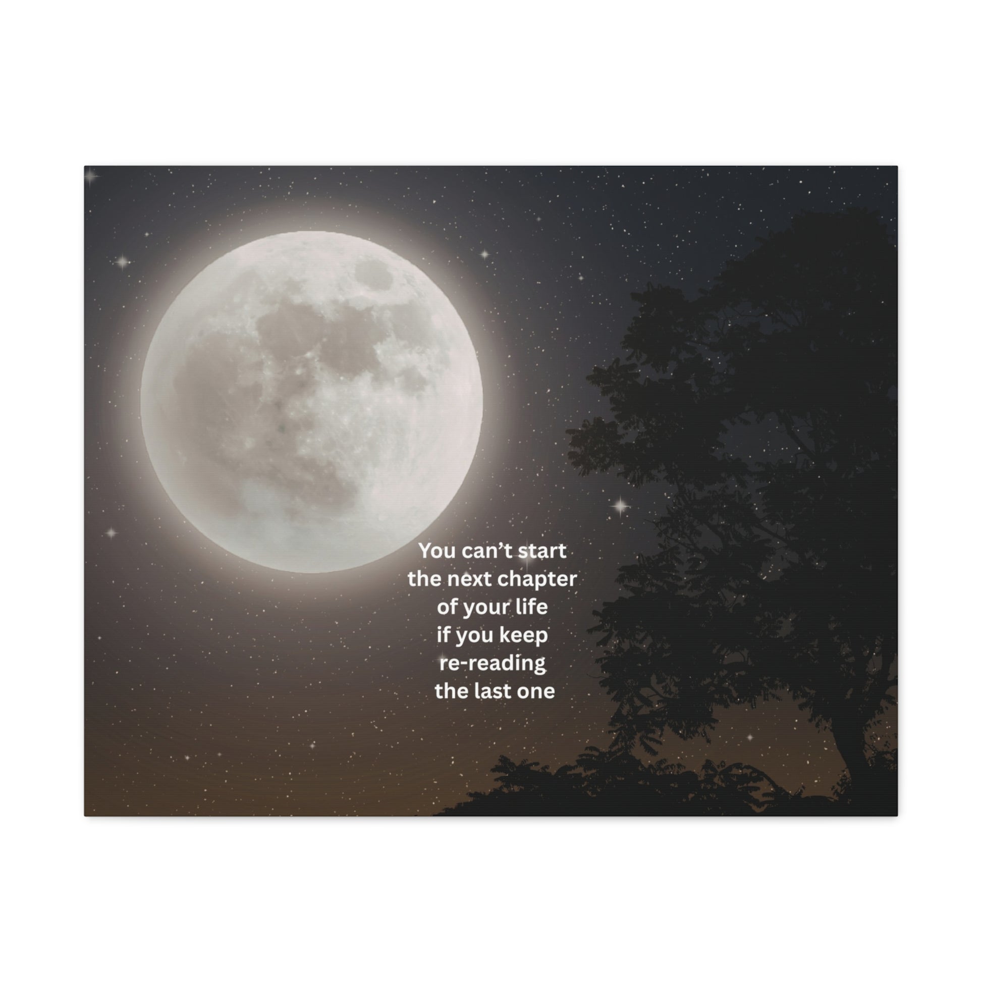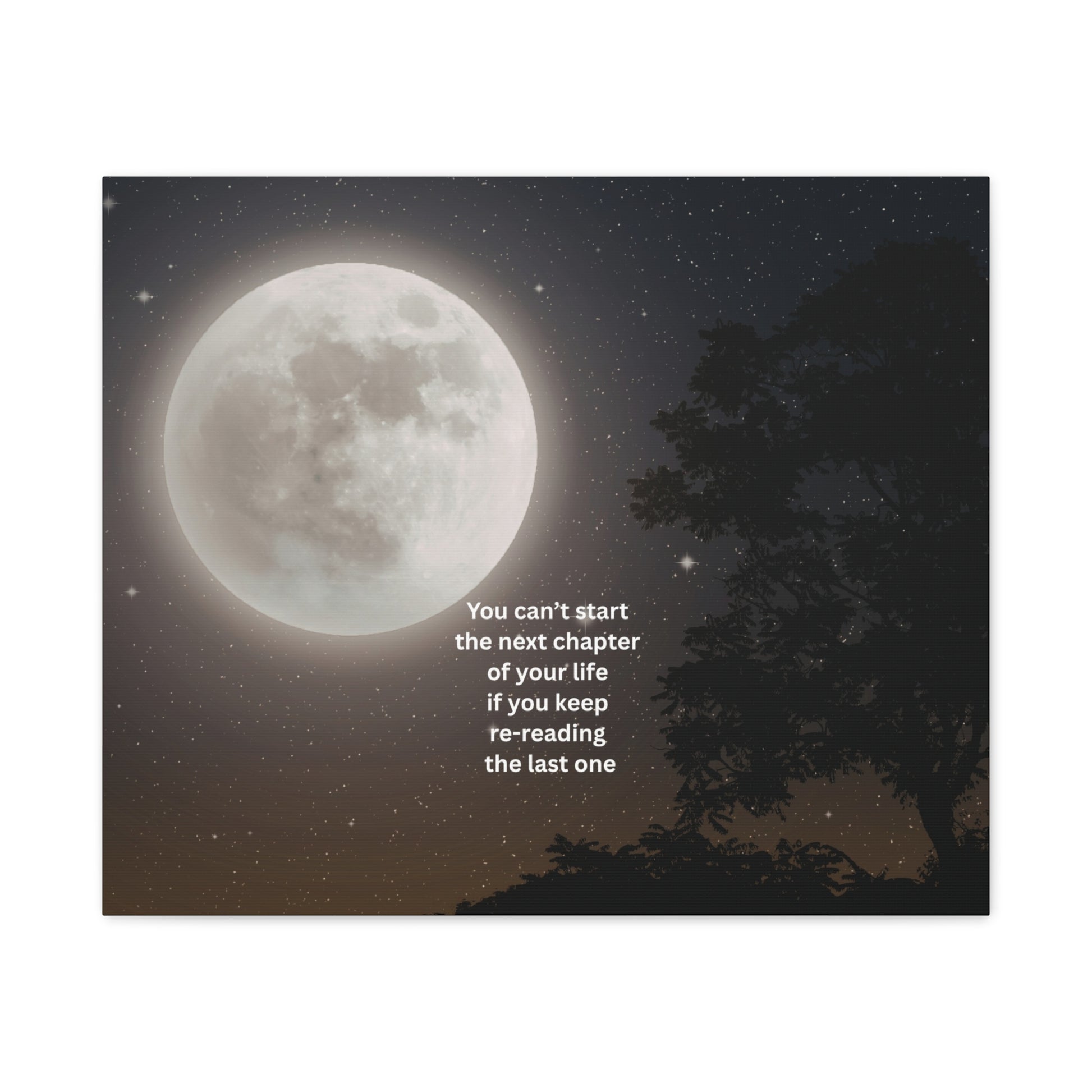 Inspirational Moon Canvas Print — "You can't start the next chapter of your life if you keep re-reading the last one"