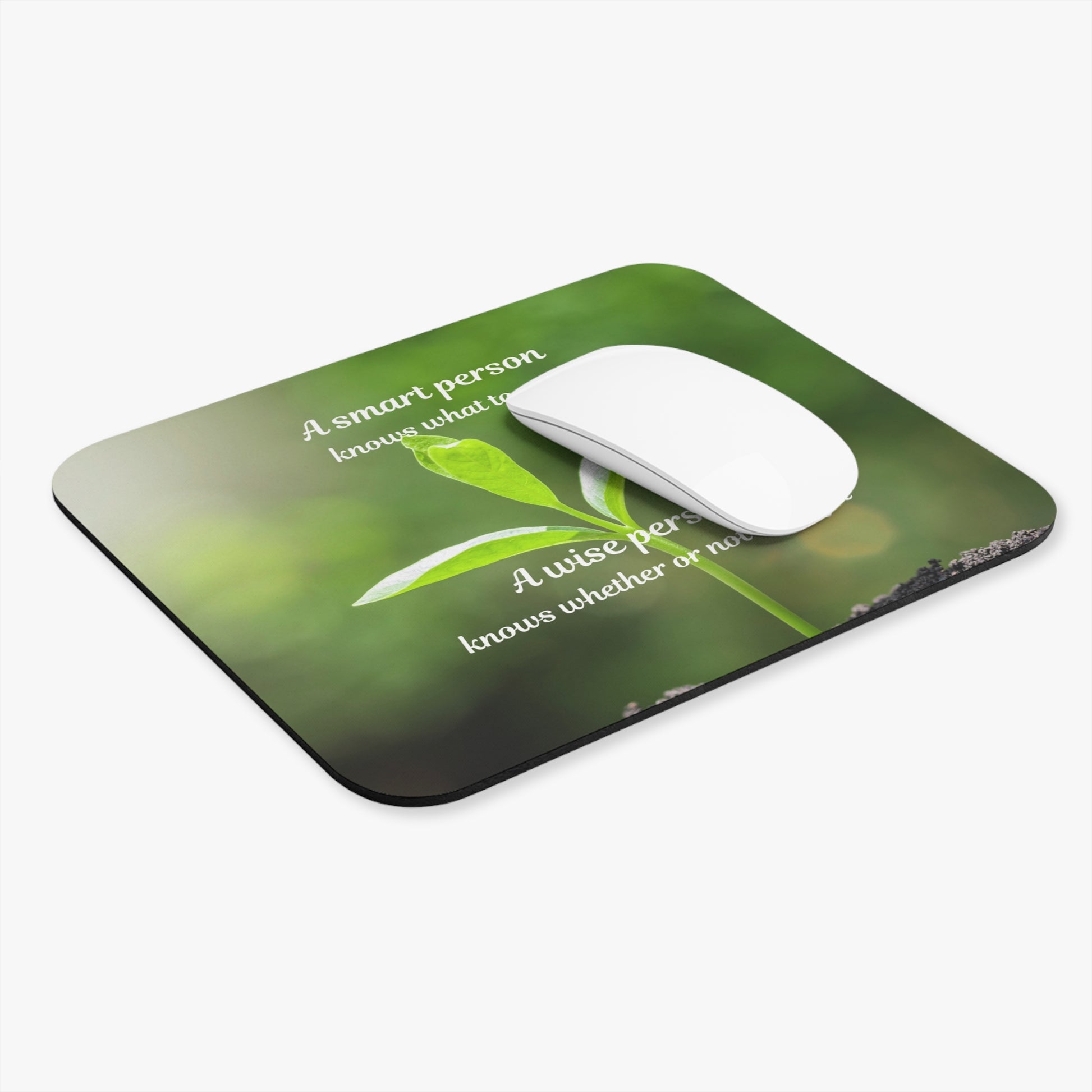 A calming rectangular mouse pad printed with a soft-focus photograph of a fresh green seedling and an understated, reflective quote: “A smart person knows what to say. A wise person knows whether or not to say it.” The gentle greens and blurred bokeh create a tranquil desktop presence that encourages mindful pauses between tasks. It sits low and smooth beneath your mouse, blending practical use with a quiet reminder to choose words with care. Fits neatly on a work desk, study table, or home office setup to bring a touch of nature and thoughtful stillness to everyday clicks.