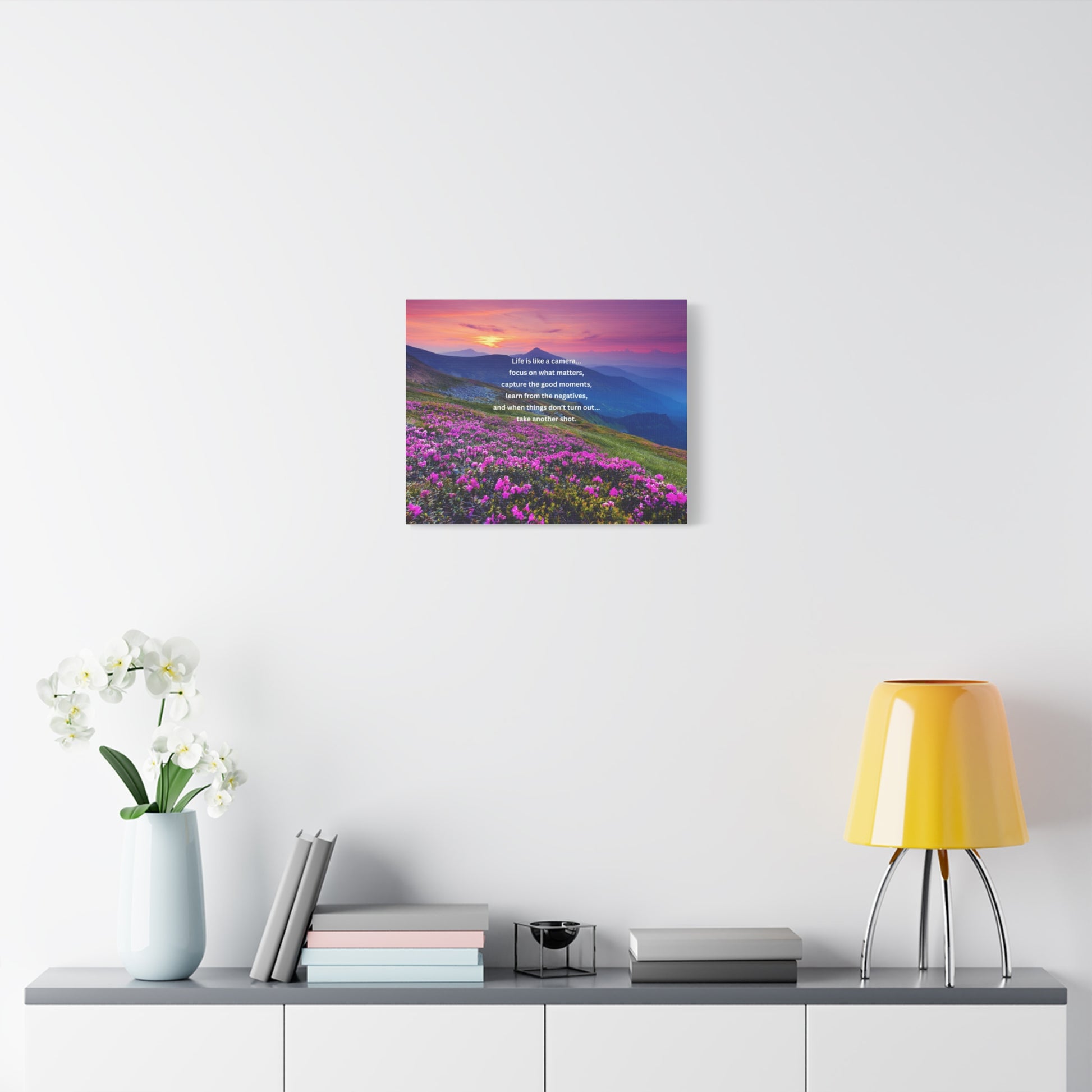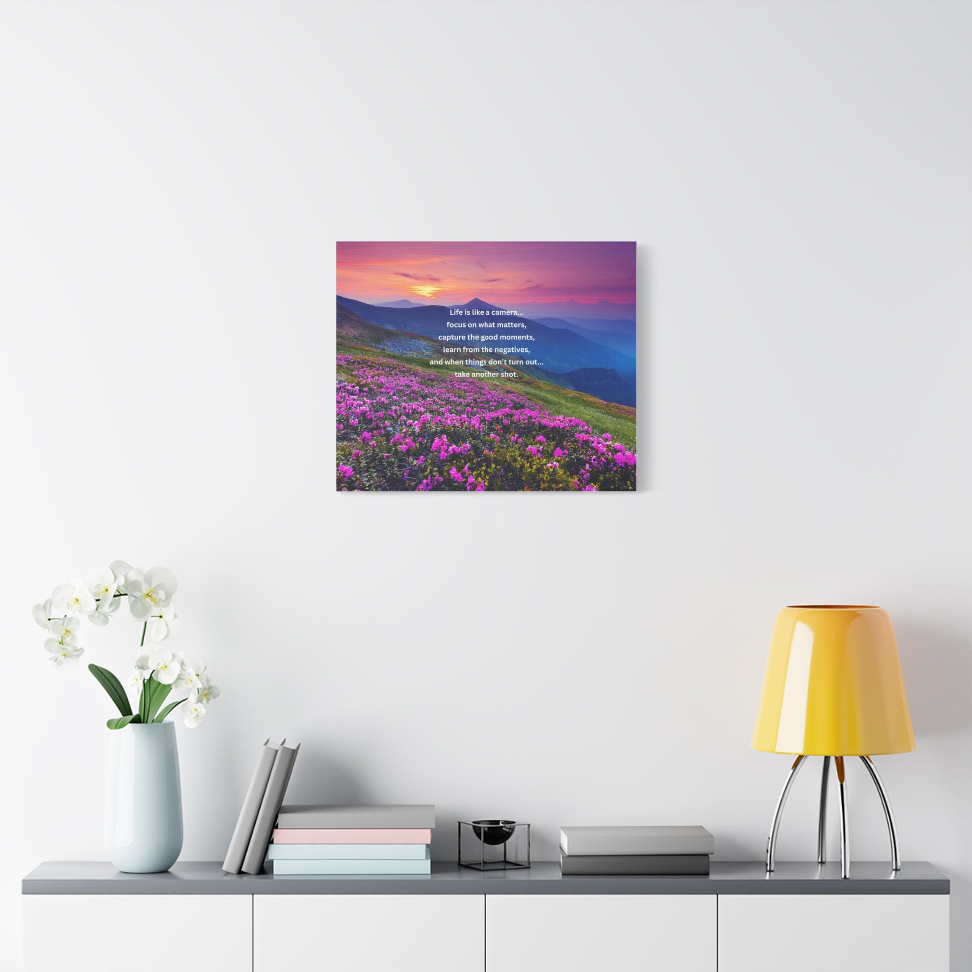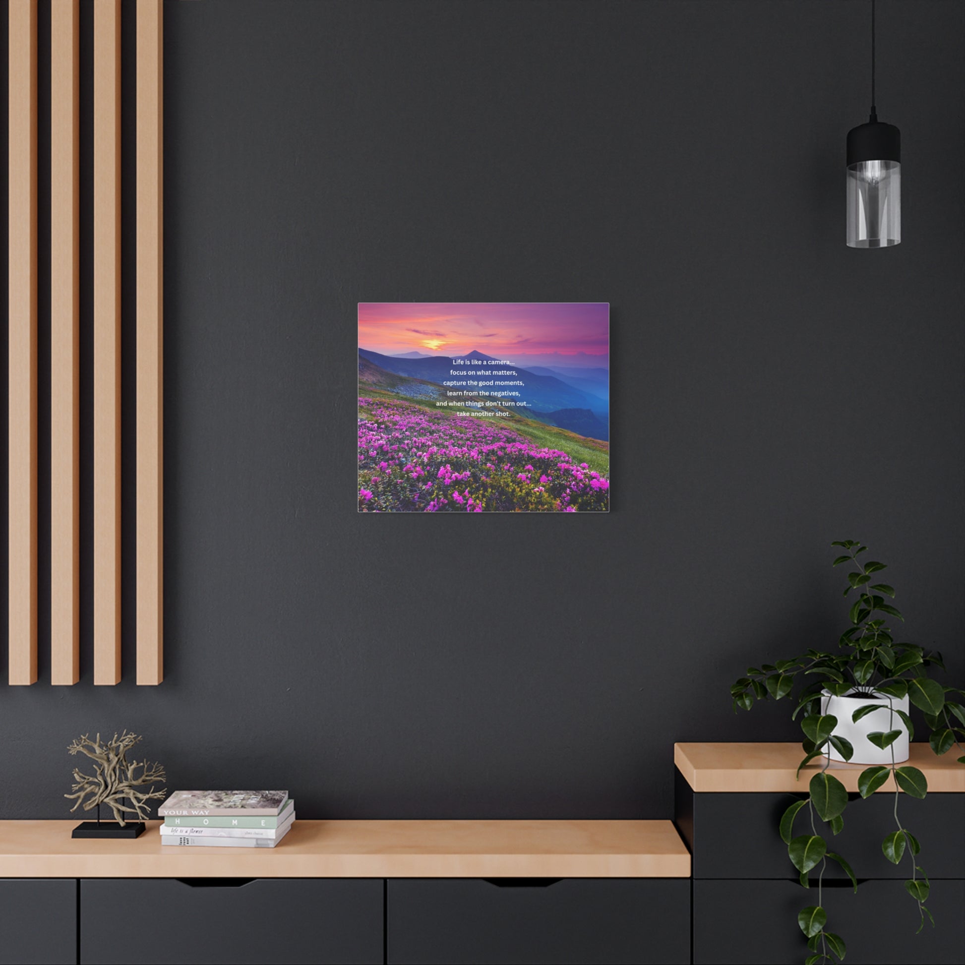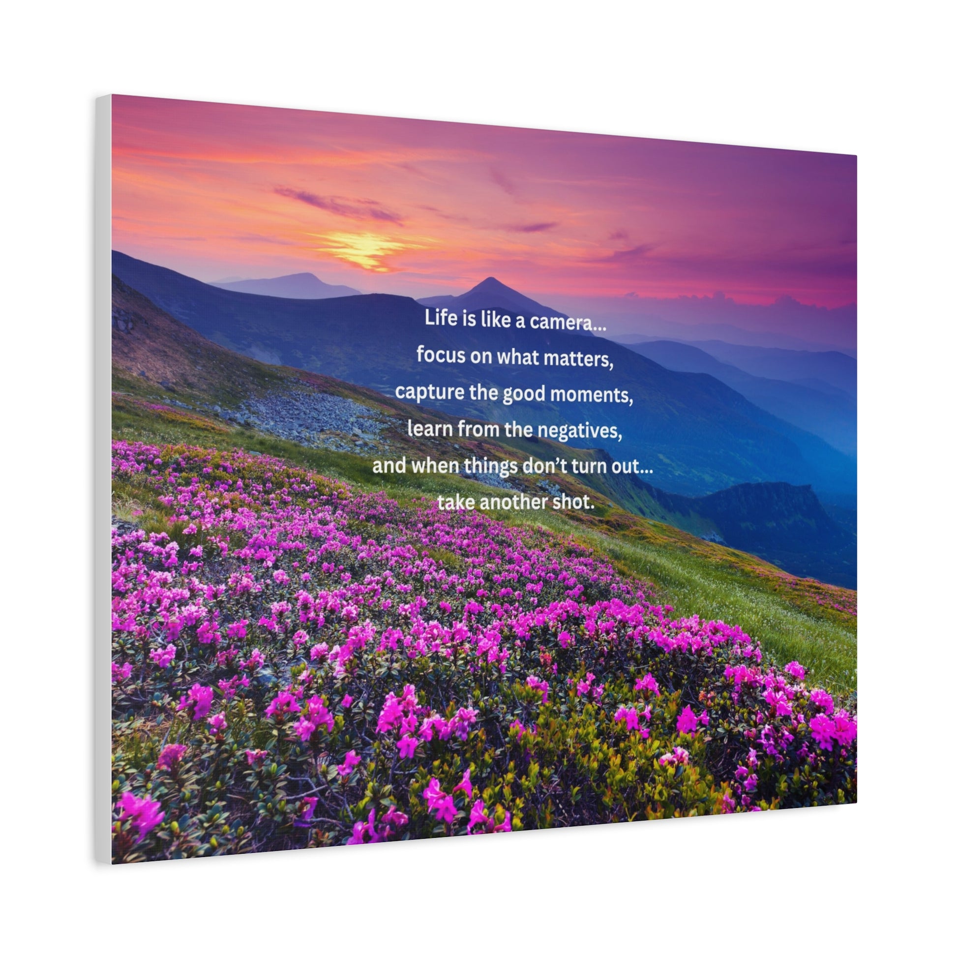 A museum-quality stretched matte canvas that brings a peaceful mountain sunrise into any room. Rich, fade-resistant inks capture the warm pink and purple light spilling across alpine peaks and a meadow of blooming wildflowers. The inspirational quote at the center — a gentle reminder to focus on what matters and try again — sits printed crisply on the matte surface for a soft, reflective finish. Lightweight but sturdy, the canvas arrives ready to hang with a slim 1.25" profile and subtle rubber feet to keep it straight against the wall.