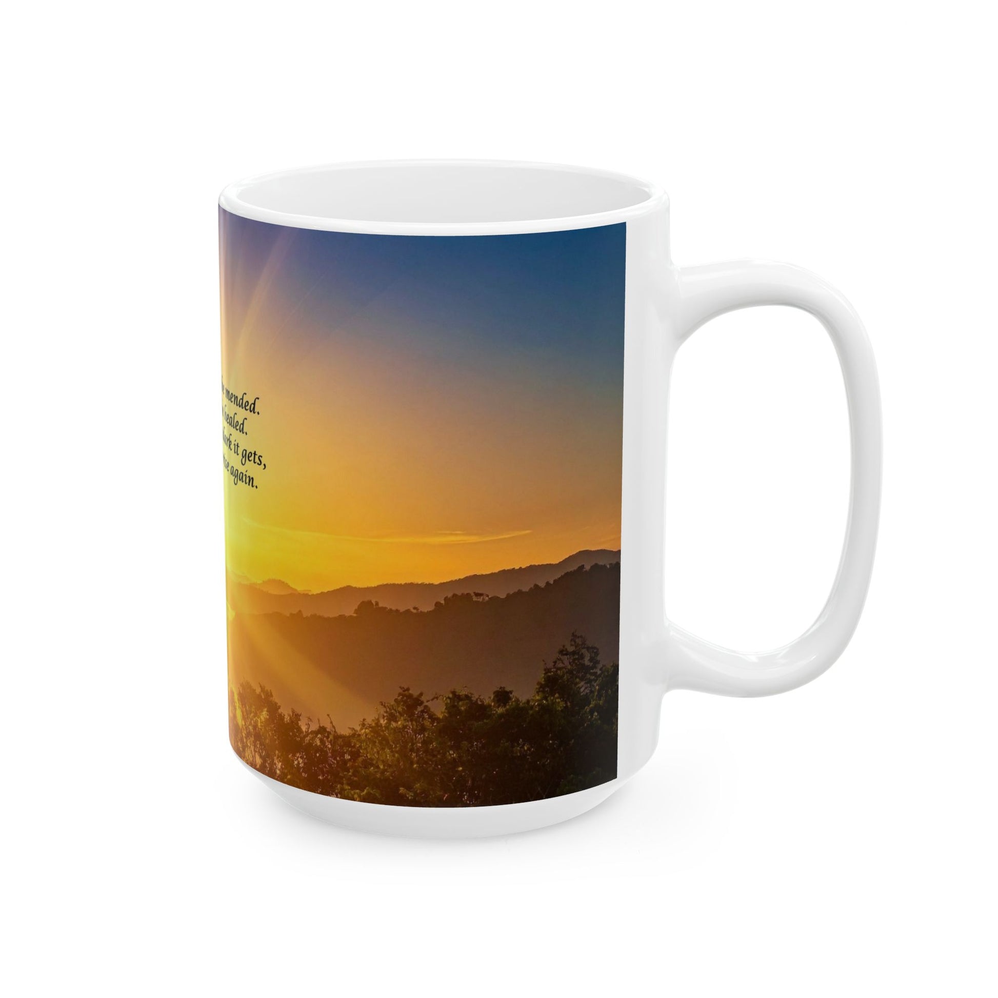 Warm light spills across a quiet valley as morning unfurls — this ceramic mug brings that gentle sunrise into your hands. A soft gradient of gold and dusky blue frames a hopeful message at the center, inviting a slow, steady breath with every sip. It sits comfortably by your desk or windowsill, the glossy finish catching light like a little promise that the day will begin again. For people who collect small rituals, quiet mornings, or comforting words, this mug becomes part of the routine: hot coffee, warm palm, and a moment of calm before the rush.