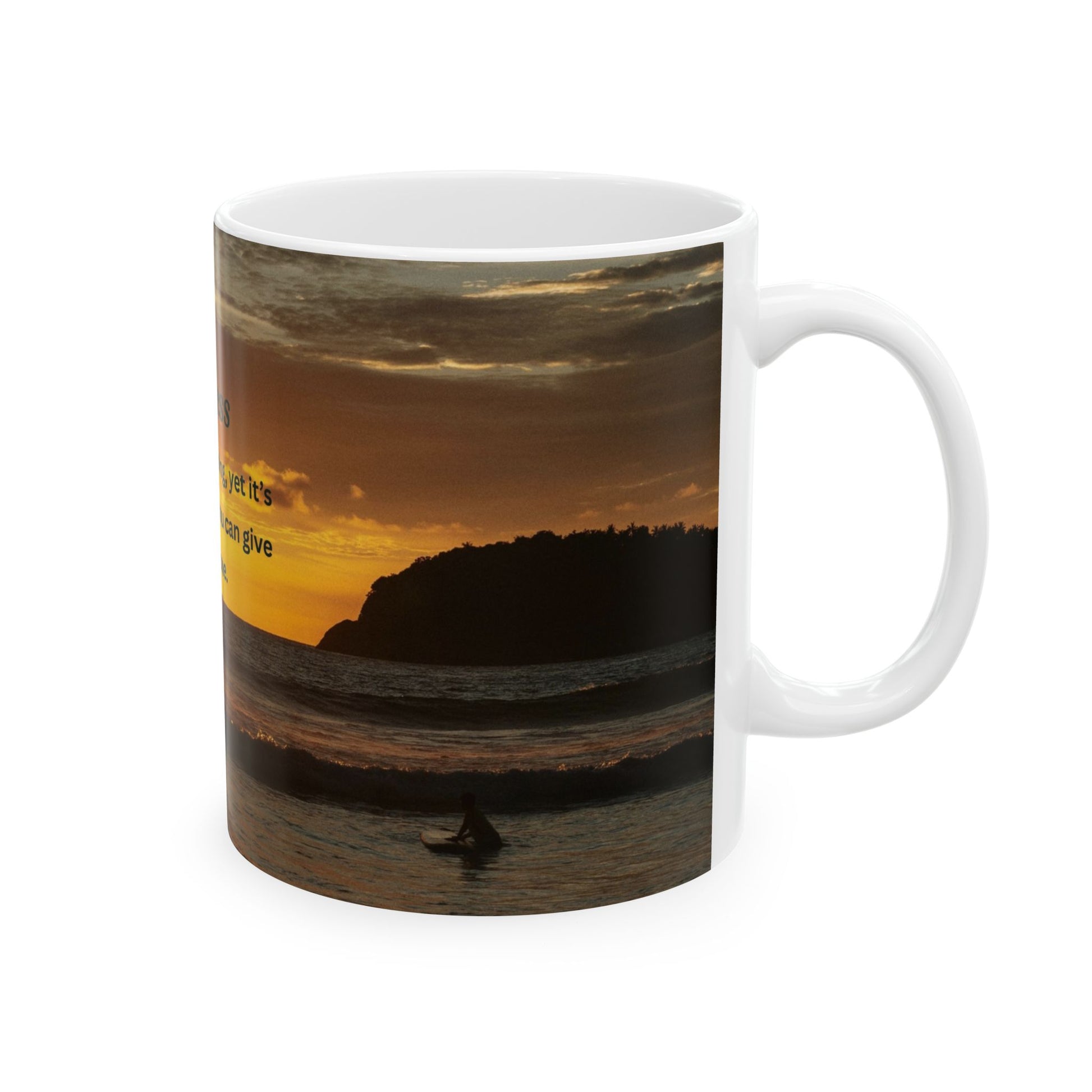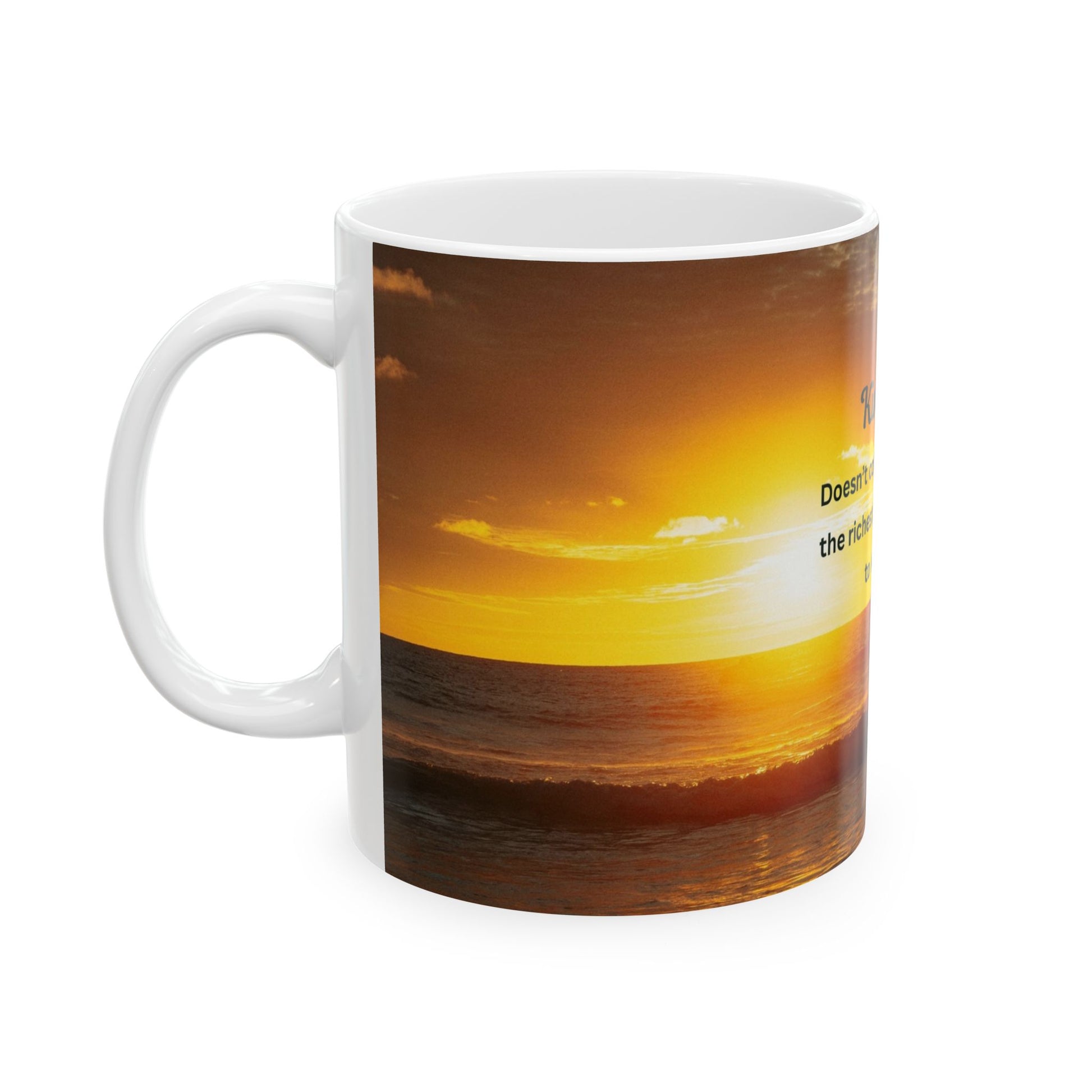 Warm sunrise over the ocean, a soft promise printed on glossy white ceramic. This mug carries a simple message about kindness that settles in slowly with each sip. It belongs on quiet mornings when light spills across a kitchen table, and in hands that reach for comfort after a long day. The vivid sunset wraparound print keeps the scene alive—golden waves, gentle clouds—and the clear, uplifting text sits like a small reminder to carry into the world. For someone who collects moments, practices small acts, or wants a mindful pause between tasks, this mug brings a little calm and encouragement to everyday routines.