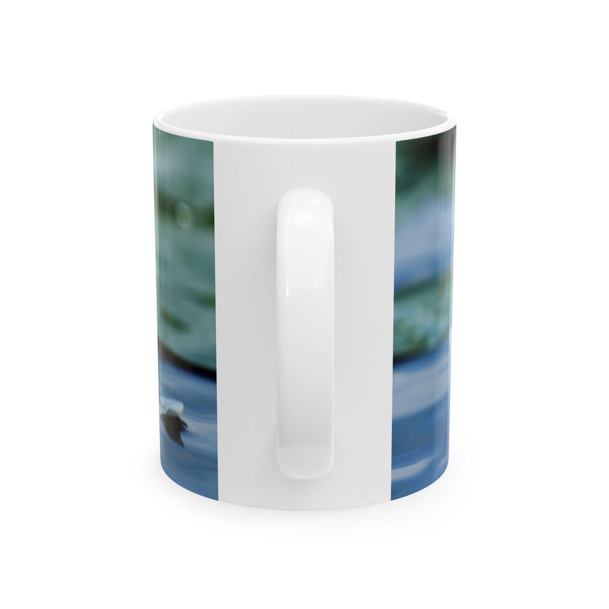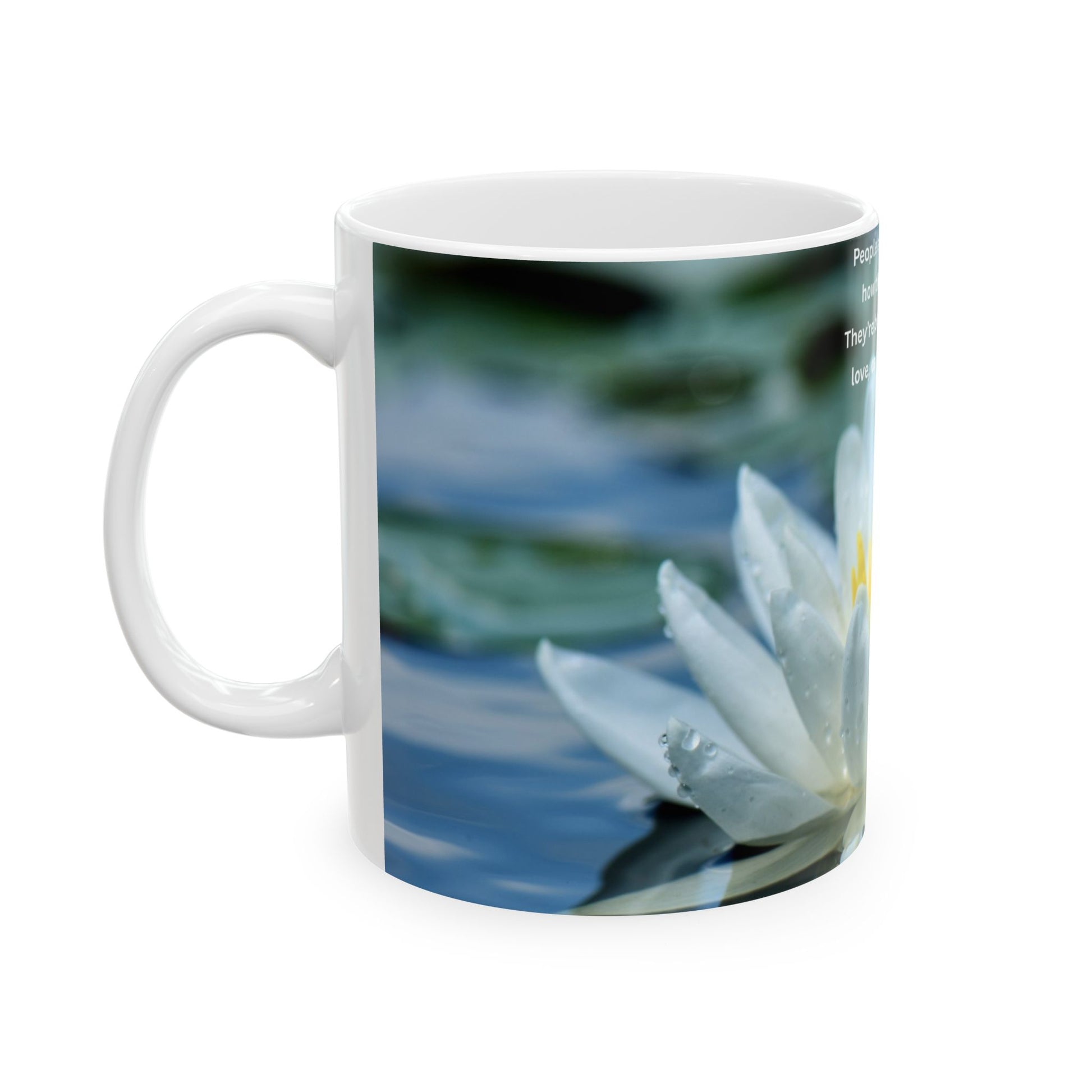 A serene ceramic mug that brings a quiet, restorative moment to your daily routine. Soft-focus water and a pale lotus bloom wrap the mug in calming blues and muted greens, while a gentle, uplifting sentiment sits above the flower — a short reminder about beauty found in how we love and treat others. The glossy finish deepens the colors and catches the light, making the image feel alive with morning calm. Hold it warm in both hands and sip something simple while you breathe out and start again.