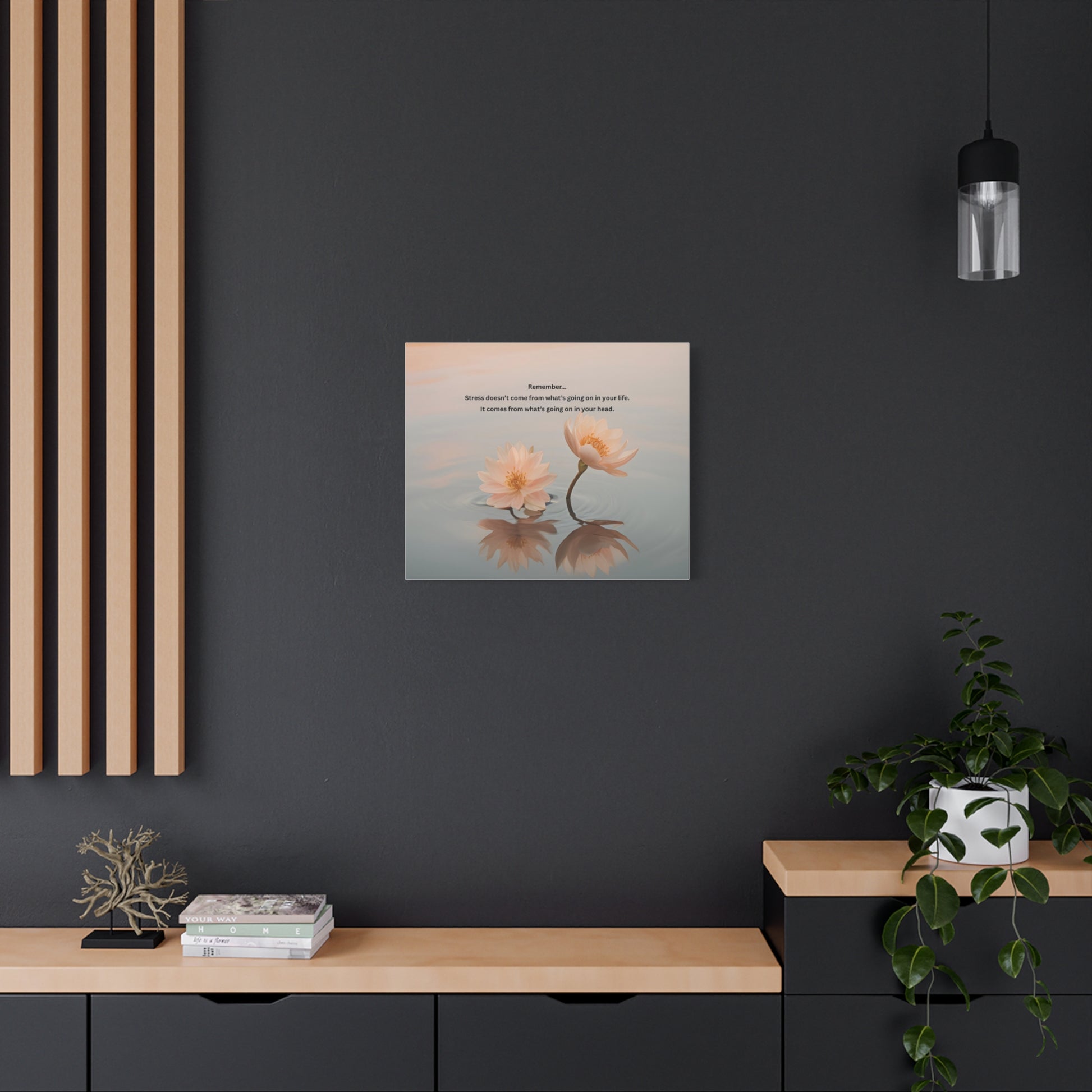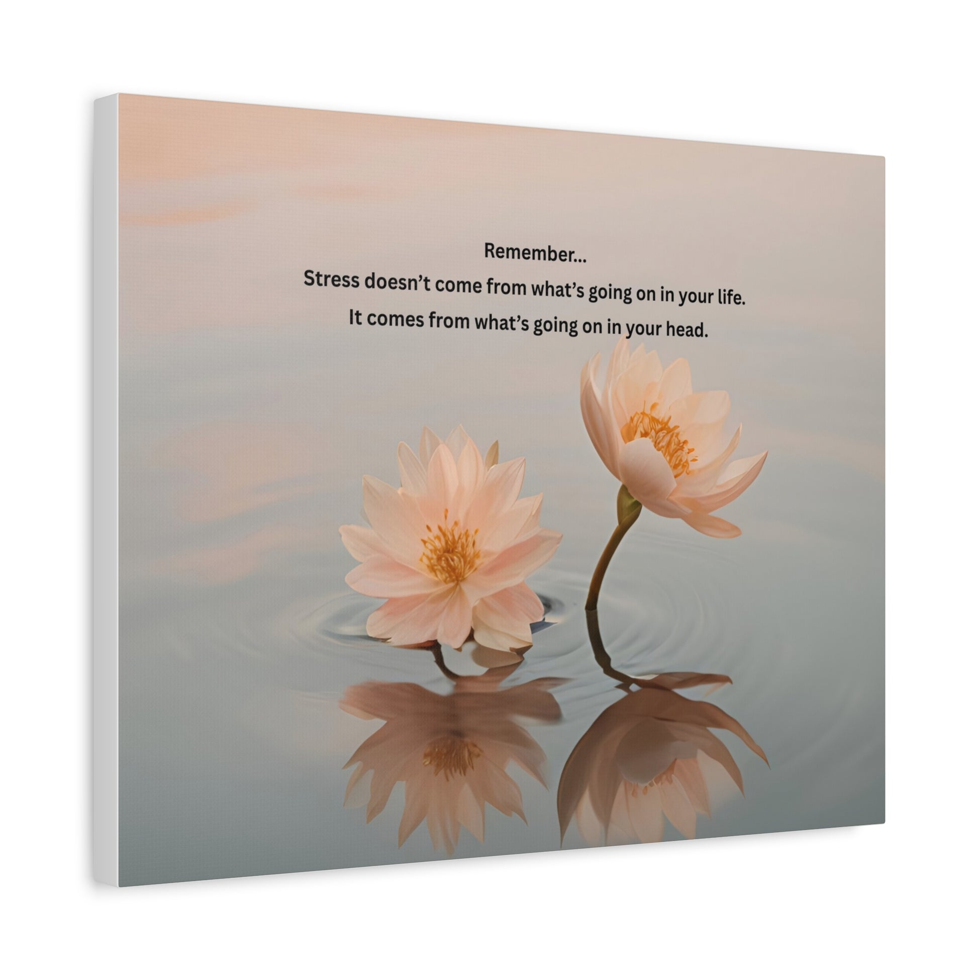 A serene matte canvas print that brings calm and clarity into quiet corners. Soft peach waterlilies float on gentle ripples, their mirrored reflections and muted pastel sky inviting a pause. A short, reflective quote sits above the blossoms — a gentle nudge to notice how thoughts shape stress. Light, museum-style edges and a subtle texture give the image a tactile, handcrafted feel that reads warm from across the room.