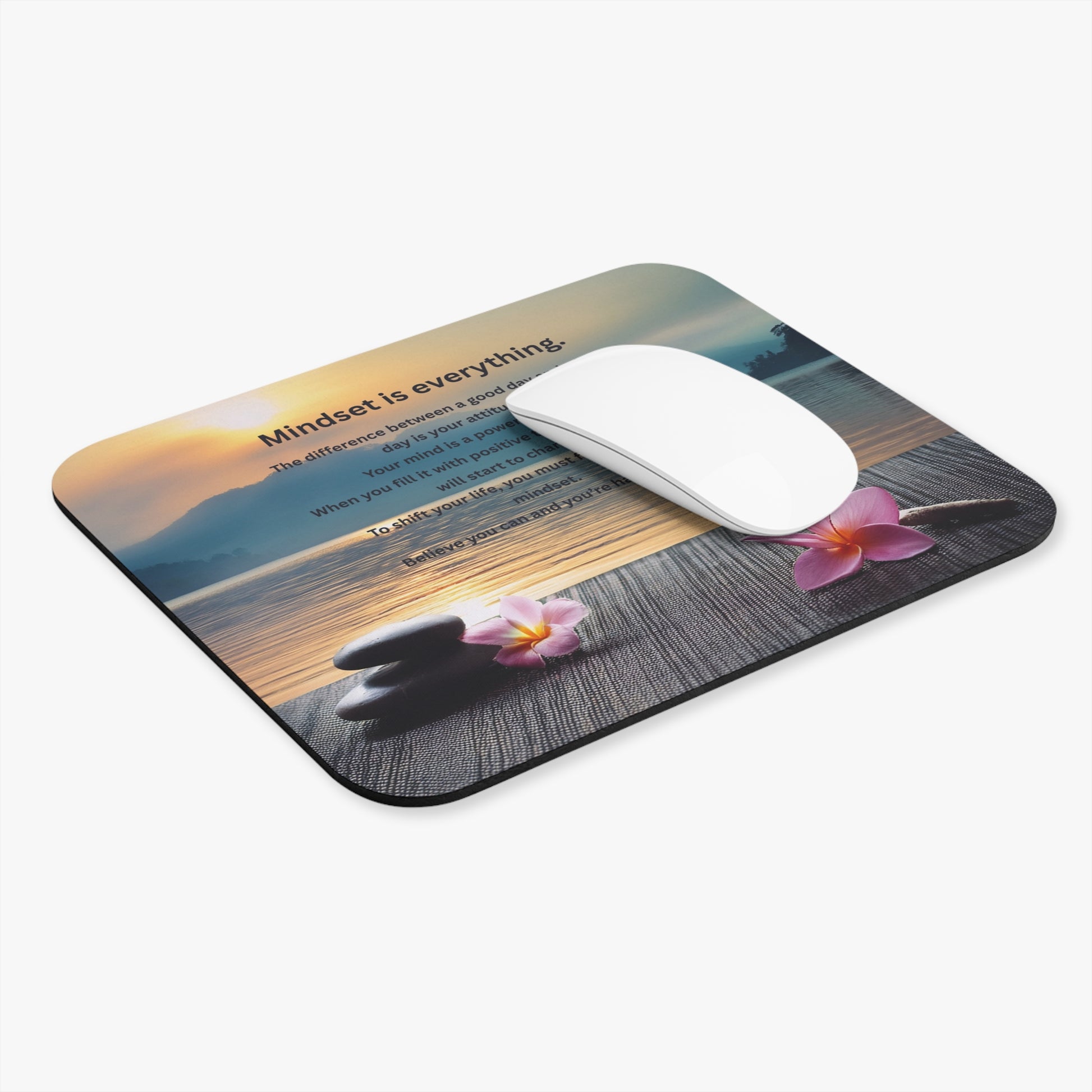 Breathe in a moment of calm every time you reach for your mouse. This rectangular mouse pad pairs a soft, smooth glide with a tranquil lakeside scene and a gentle affirmation: “Mindset is everything.” Warm sunrise tones, stacked stones, and delicate plumeria flowers invite a quiet pause between tasks. The low-profile foam keeps your desk feeling tidy while the non-slip rubber base holds the mat steady during long work sessions. It’s meant for someone who values small rituals—those seconds of reflection that steady the day and refocus the mind.