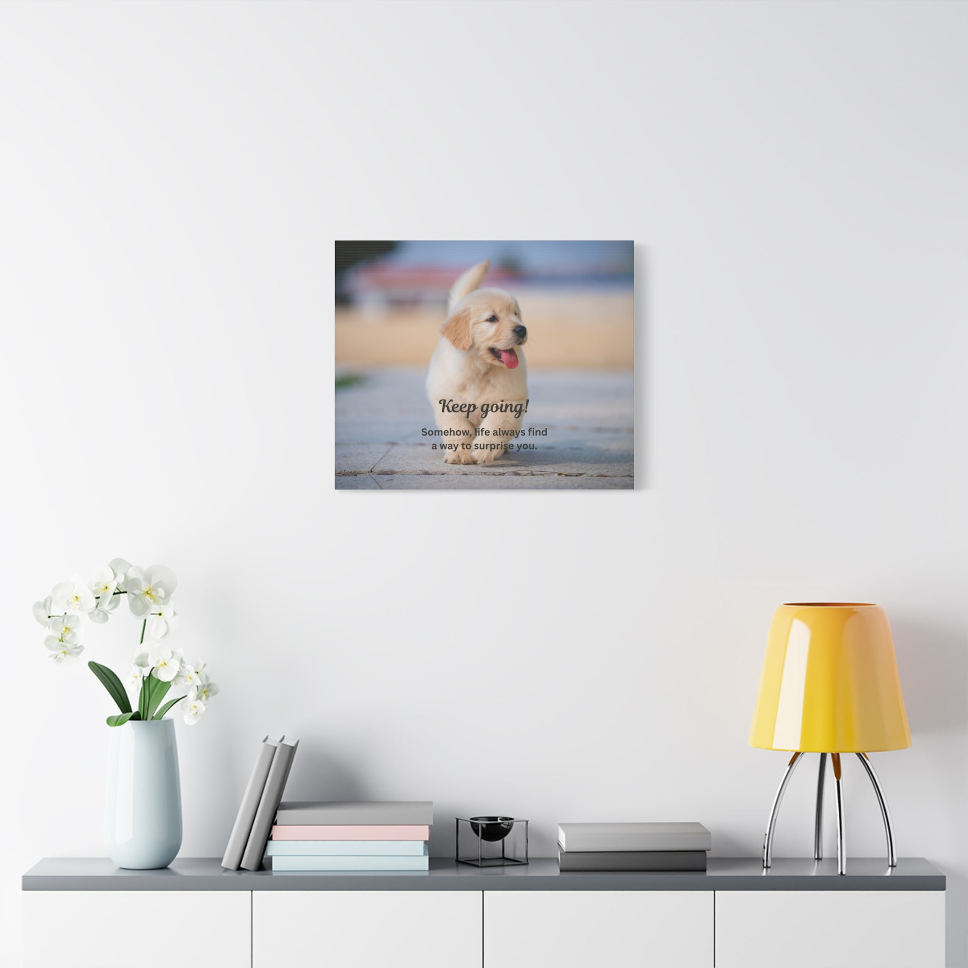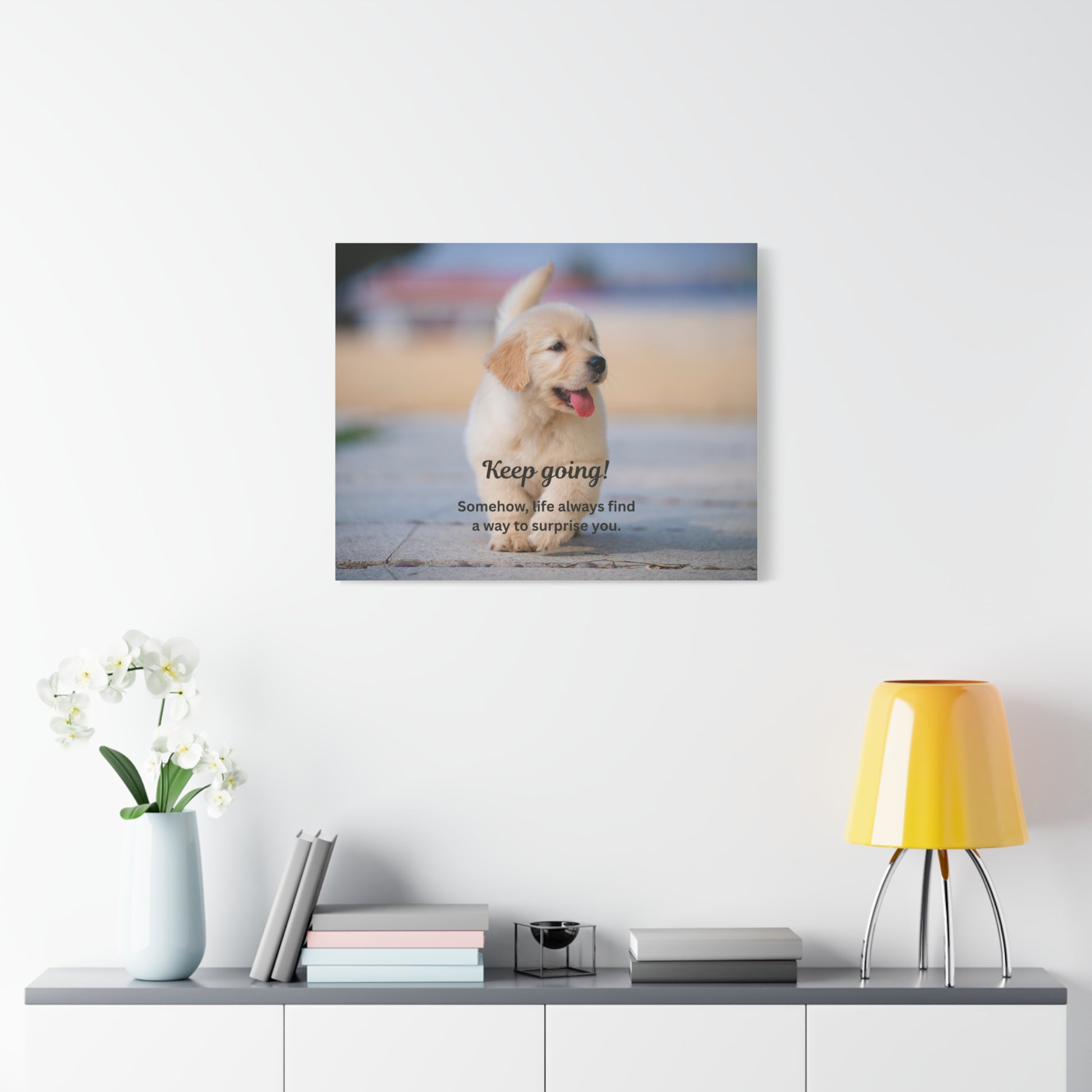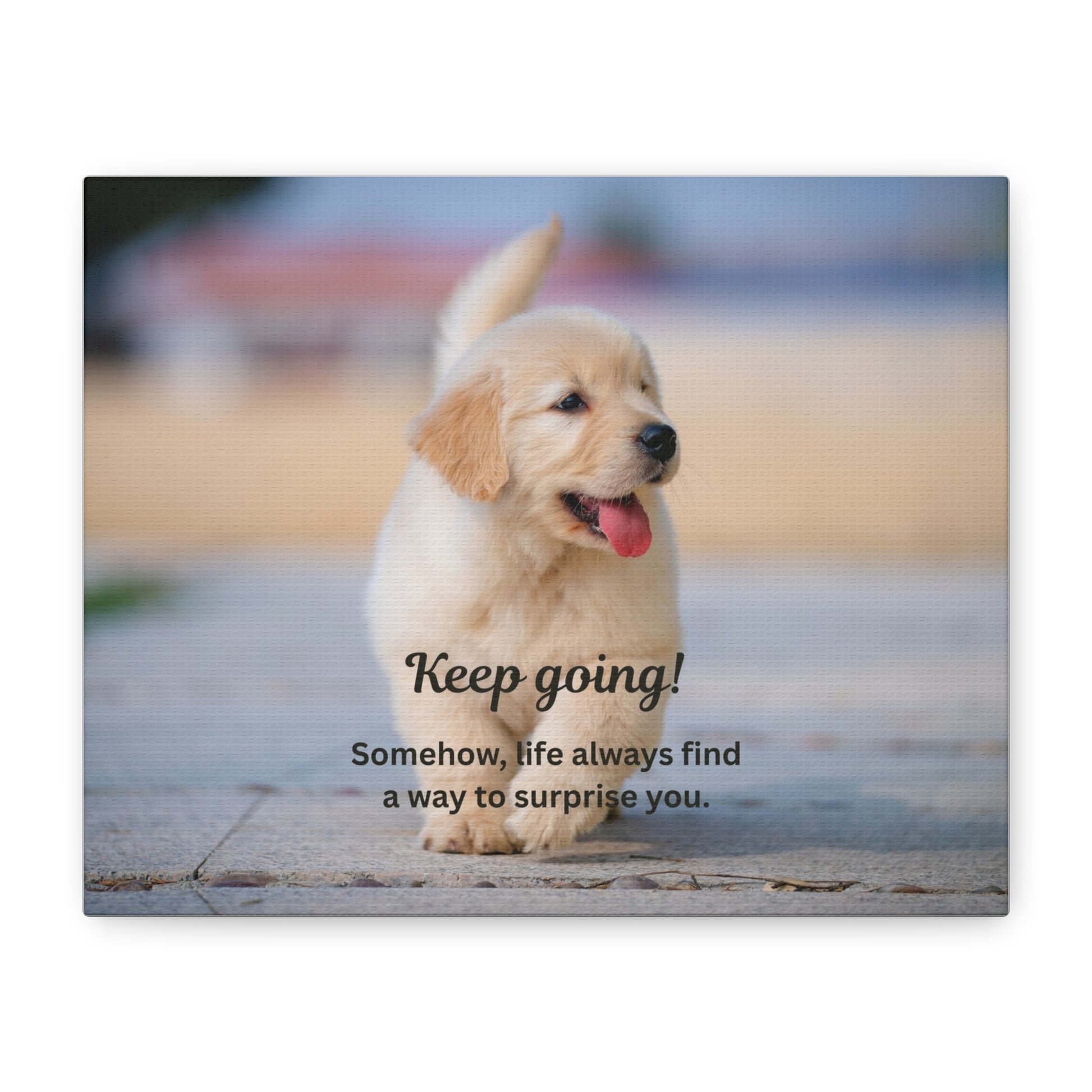 A warm, stretched matte canvas print featuring an adorable golden retriever puppy mid-trot, with the encouraging message “Keep going! Somehow, life always finds a way to surprise you.” Soft, natural colors and a shallow depth-of-field give the image a cozy, uplifting feel. The 1.25" profile adds presence on the wall while keeping the piece approachable and easy to arrange among other decor. Hang it in a hallway, nursery, or workspace to bring steady comfort, quiet optimism, and a friendly reminder to keep moving forward.
