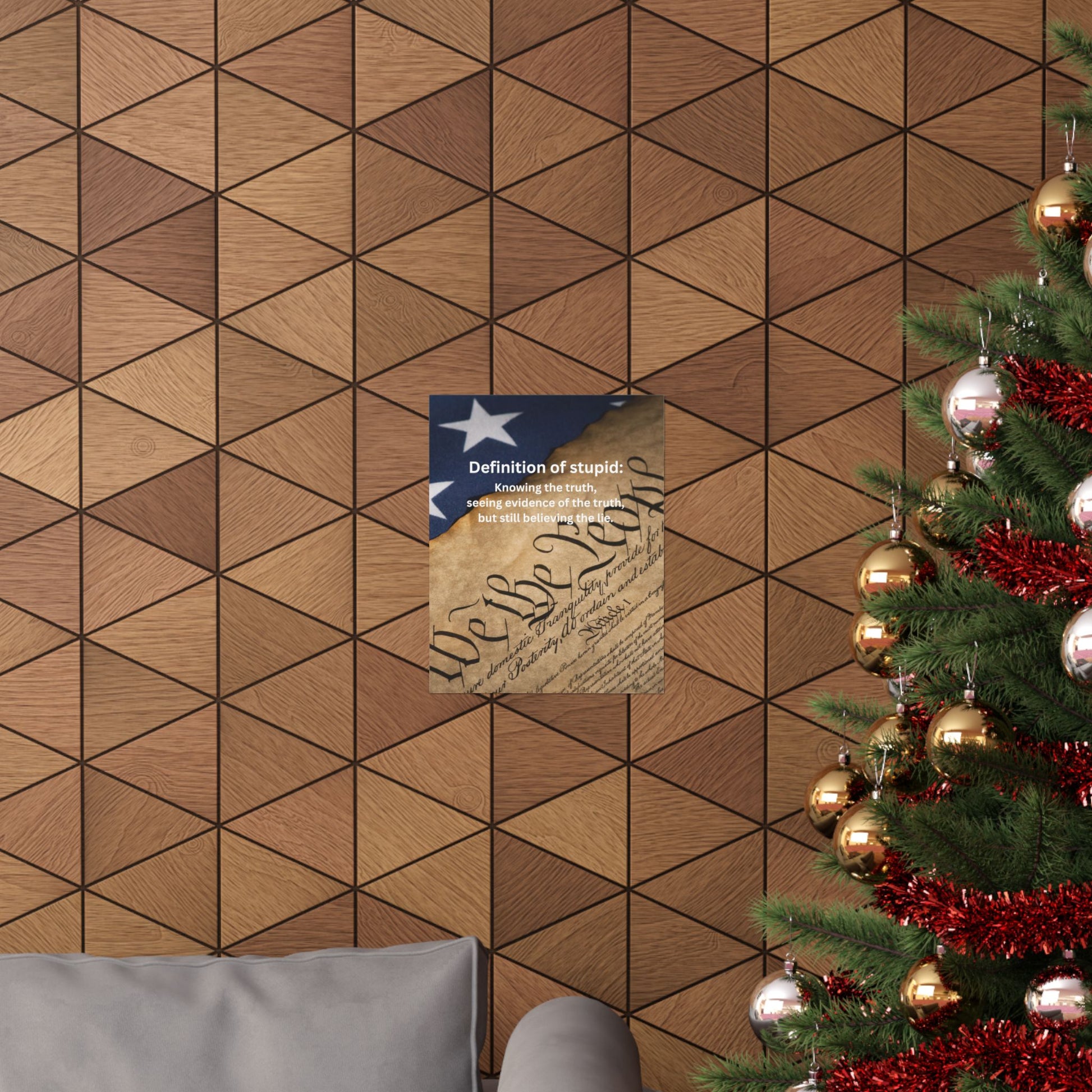 This matte vertical poster layers a weathered parchment replica of the U.S. Constitution over a muted American flag, with bold, white text that reads: “Definition of stupid: Knowing the truth, seeing evidence of the truth, but still believing the lie.” The archival museum-grade paper and Giclée printing preserve deep ink tones and fine script detail while the light-absorbing matte finish reduces glare for indoor display. Available in many sizes, it brings a quiet, confrontational presence to home offices, study nooks, political workspaces, or civic meeting rooms — a piece that prompts conversation without shouting.