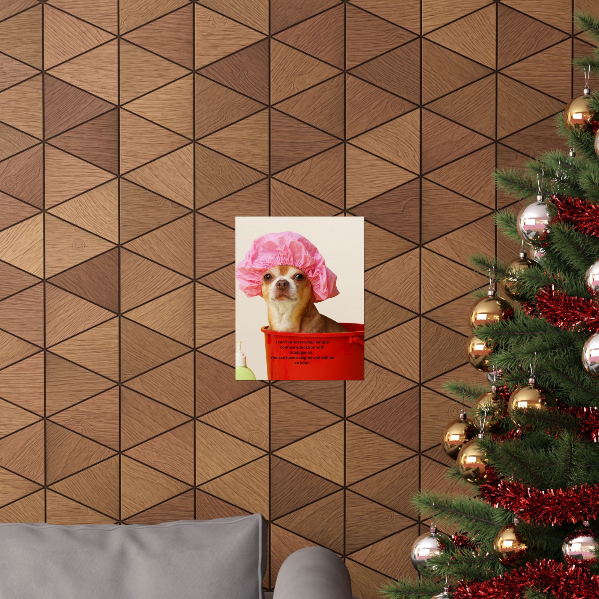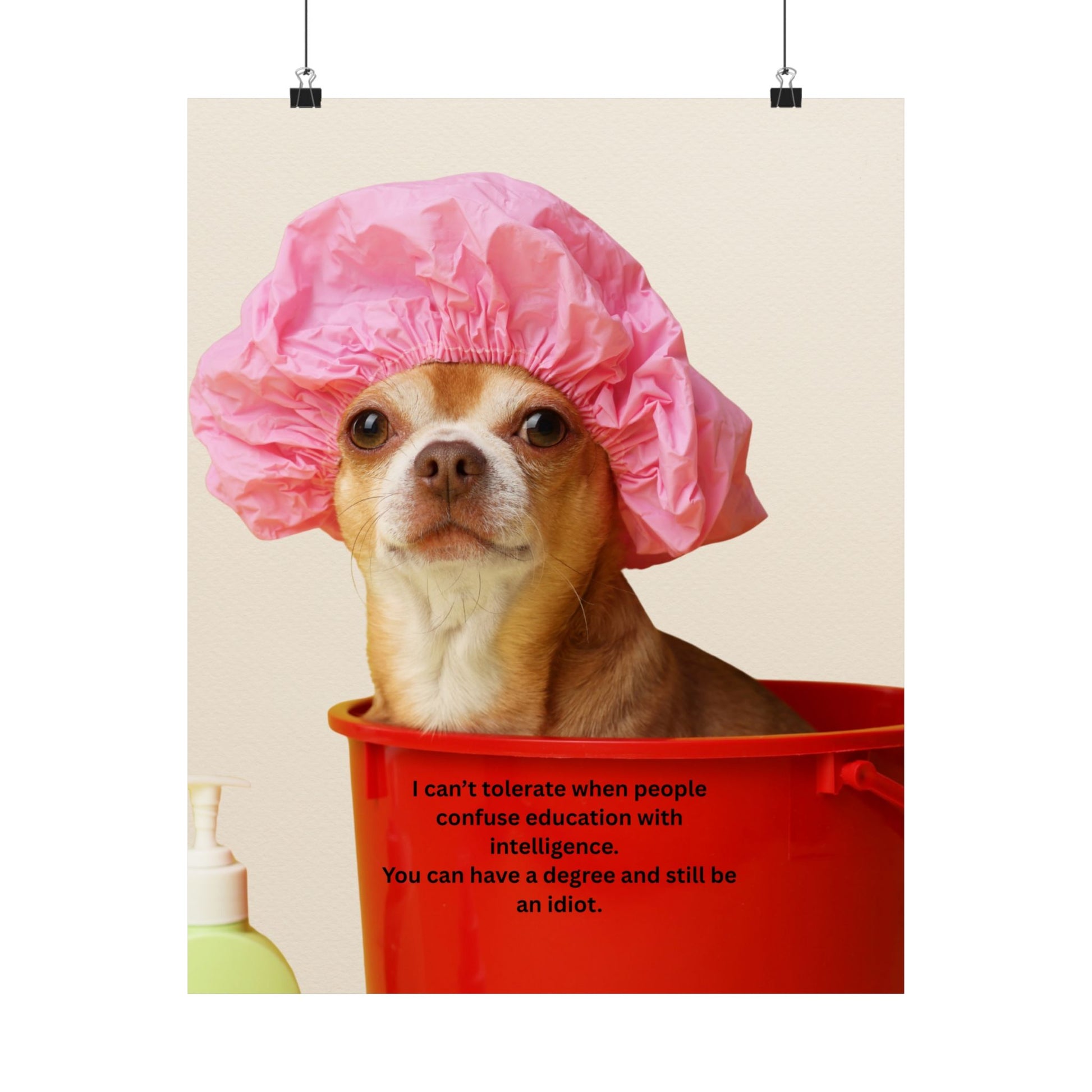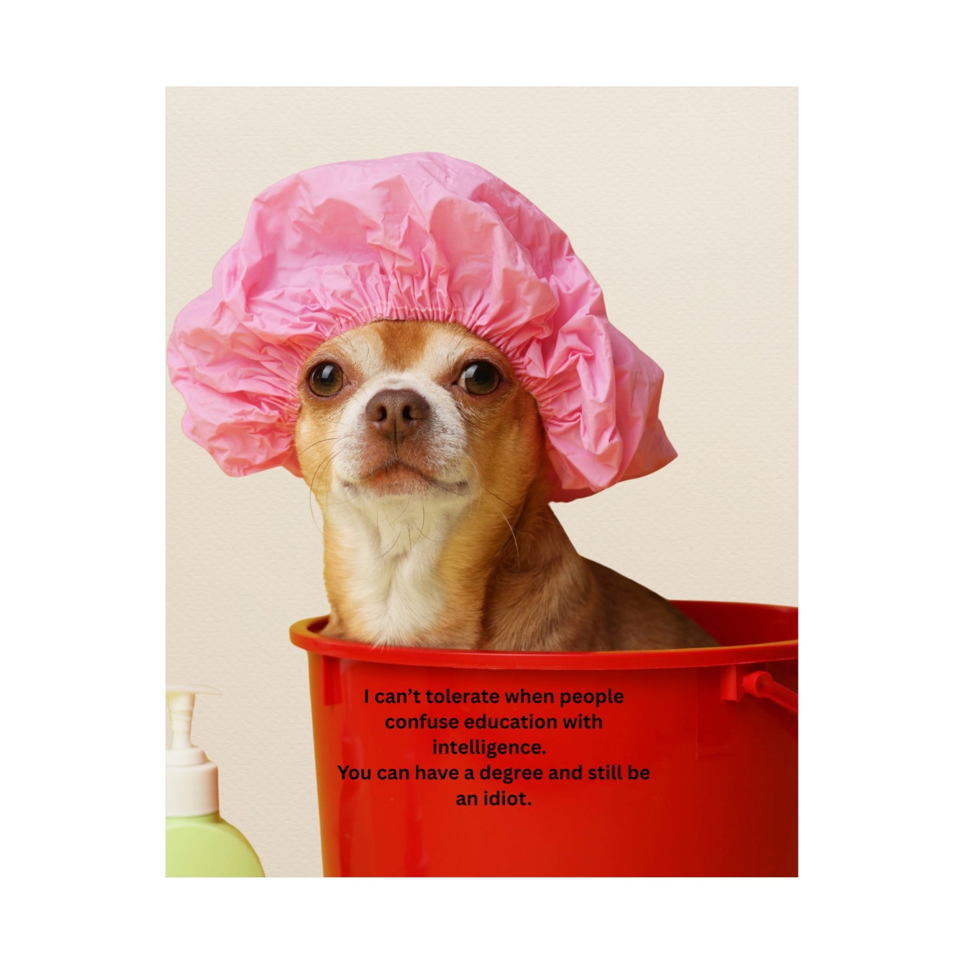 Poster - Funny Chihuahua Shower Cap Quote (I Can't Tolerate When People Confuse Education With Intelligence)