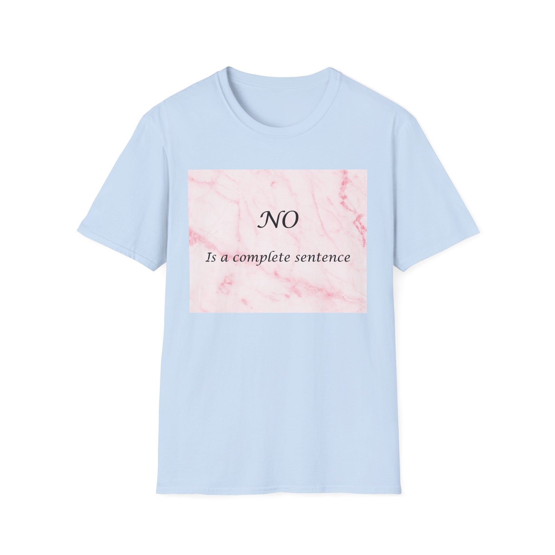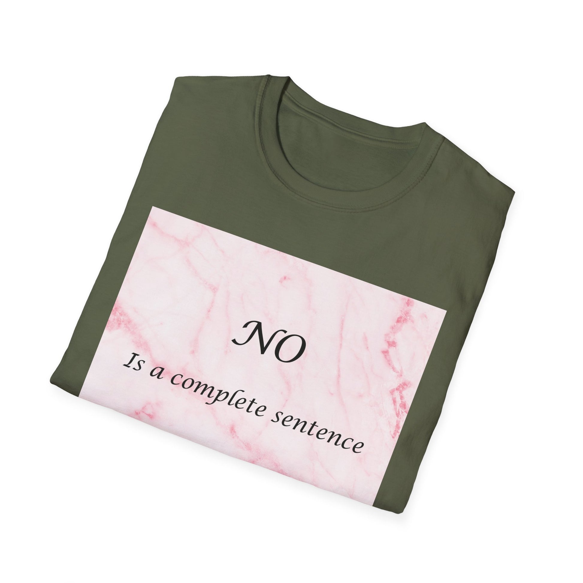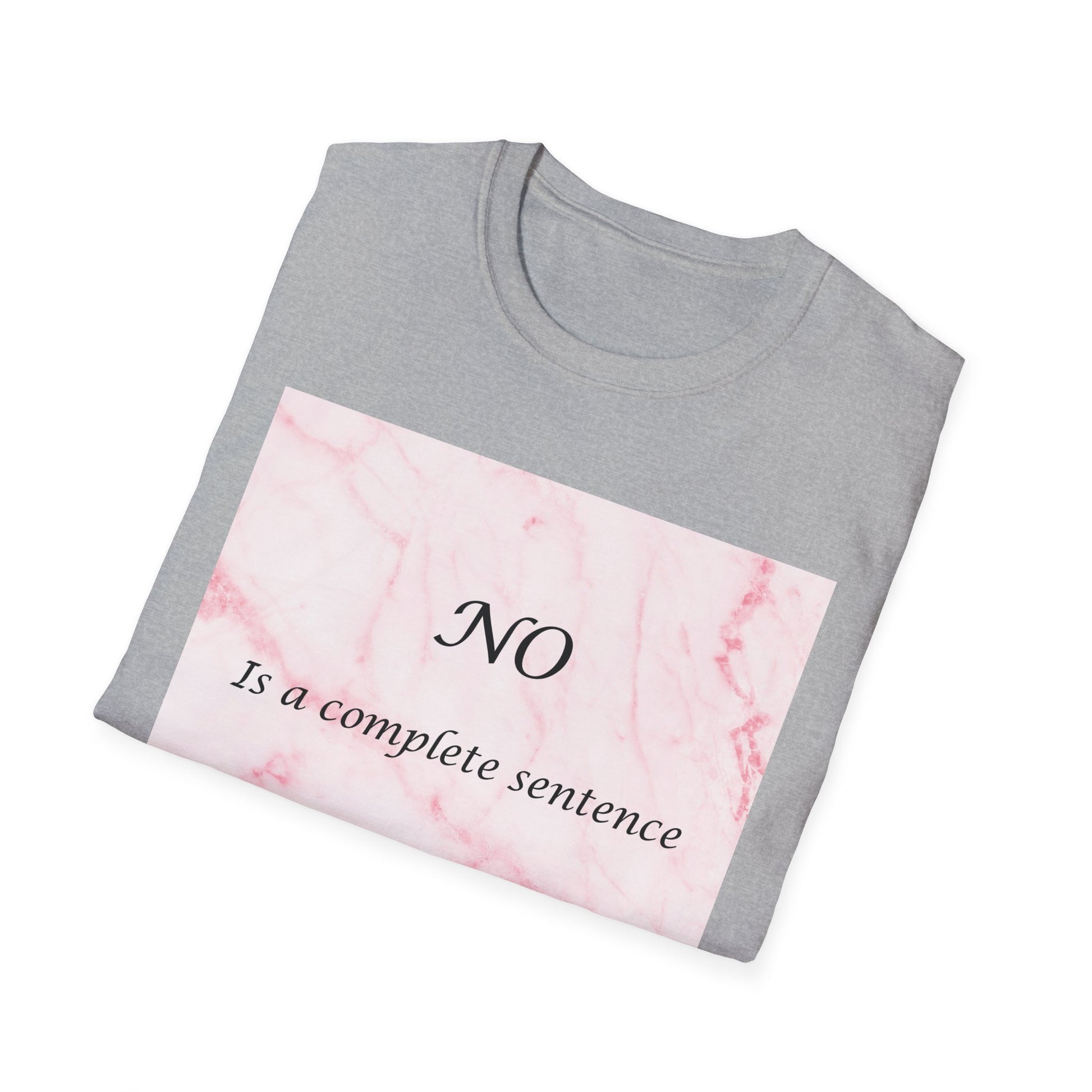 Elevate your wardrobe with this stylish Softstyle T-Shirt, featuring a chic marble-inspired design that conveys a sense of elegance and confidence. Perfect for those who appreciate humor and straightforwardness, this tee communicates the message "NO is a complete sentence" in a playful yet sophisticated manner. Ideal for casual outings, brunches, or even cozy nights in, this shirt is a versatile addition to any fashion-forward individual’s collection. It makes a fantastic gift for friends or loved ones who embody self-assurance and wit. Targeted towards adults, this T-shirt is suitable for various occasions, including birthdays, holidays, or simply adding a touch of motivation to your daily life.