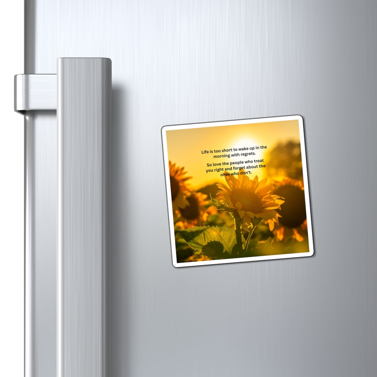 A sunlit magnet that carries a warm, hopeful message. Golden sunflowers glow under morning light while an uplifting quote encourages choosing people who treat you well and letting go of the rest. Lightweight and matte, this square vinyl magnet brings a quiet moment of encouragement to your fridge, locker, or any metal surface. It’s more than decoration — it’s a daily nudge to start the day with clearer priorities and a calmer heart.