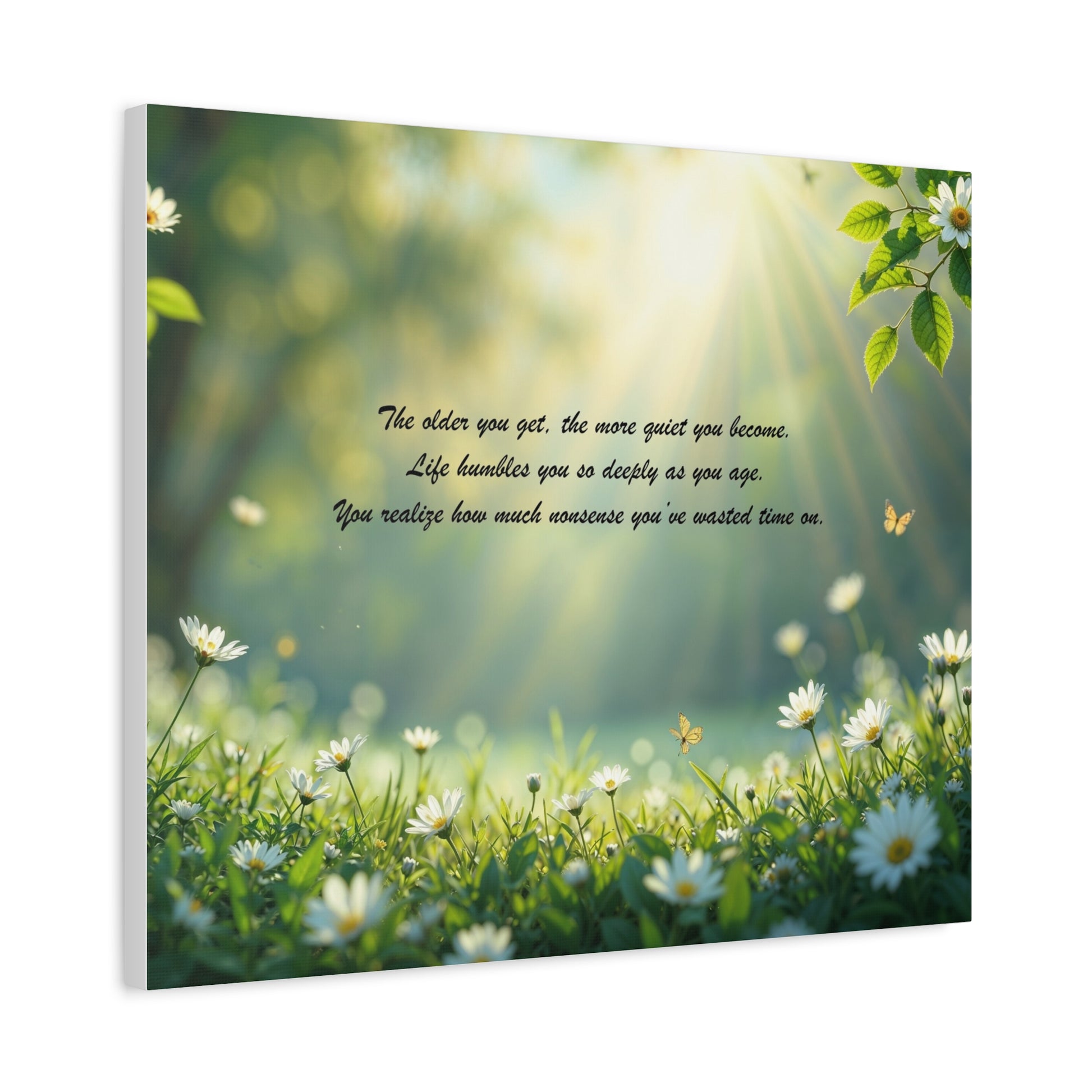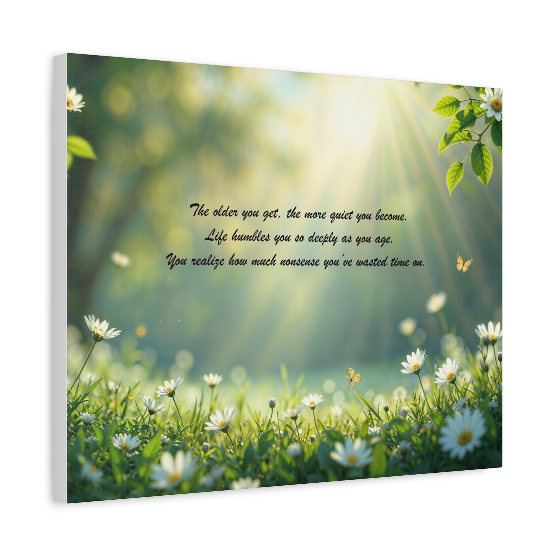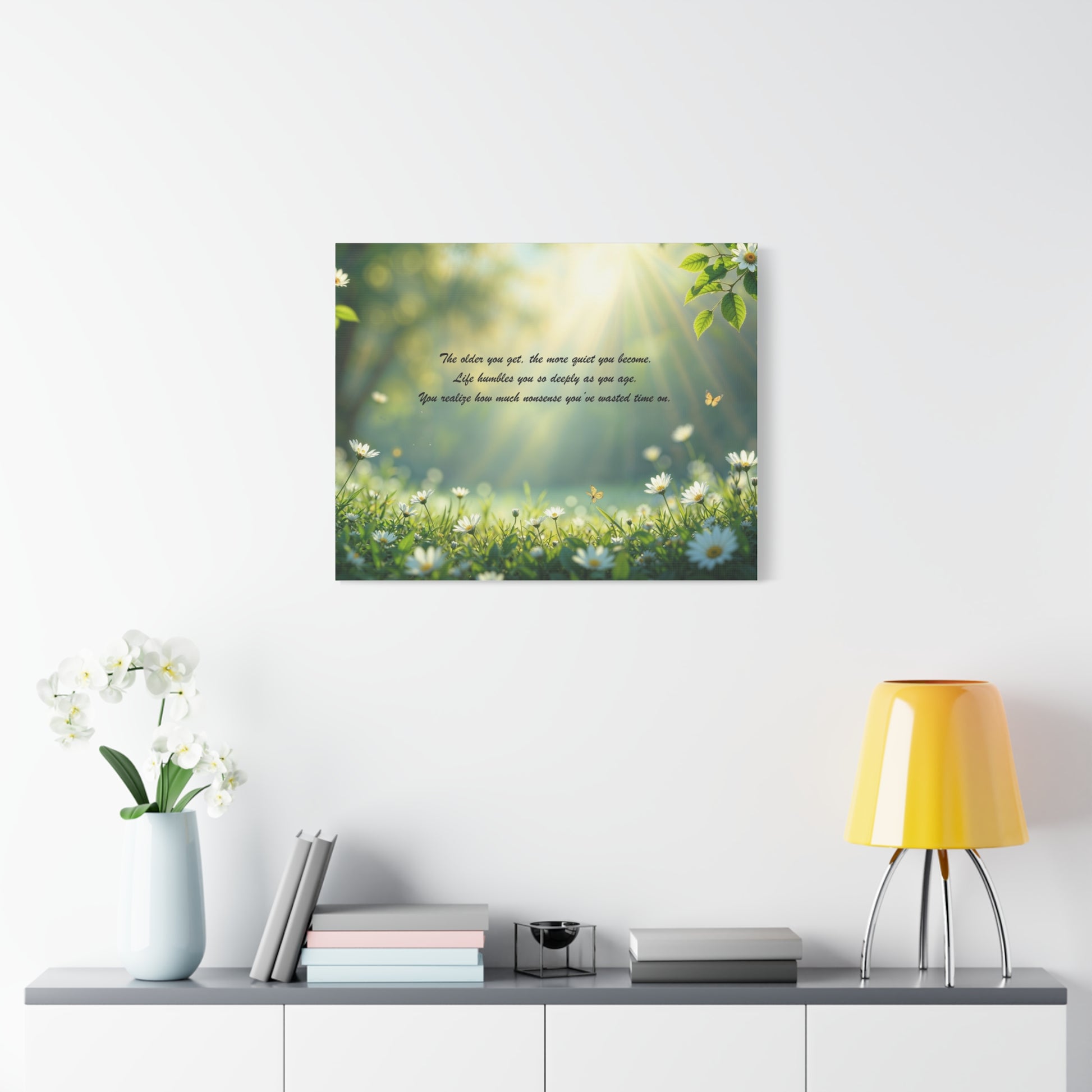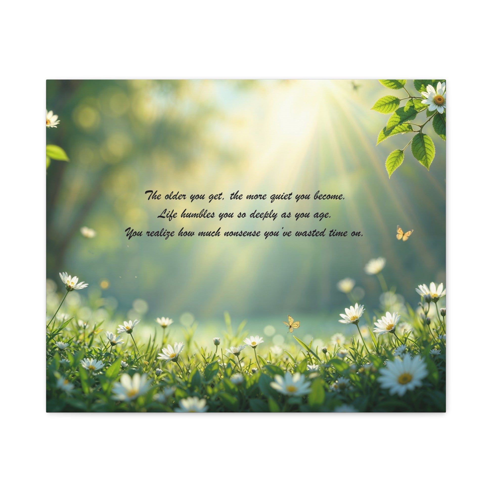 This stretched matte canvas brings a quiet morning into any room. Soft rays of sunlight sift through leaves, warming a meadow of daisies and tiny butterflies — a scene that slows the breath and invites a moment of calm. The gentle script quote at the center reads like a private note to the soul, lending the piece a reflective, restorative presence. Mounted on a slim 1.25" pine profile with a smooth matte finish, the image holds true-to-life color and fine detail without glare, creating a cozy focal point above a reading nook, entryway bench, or bedside table.