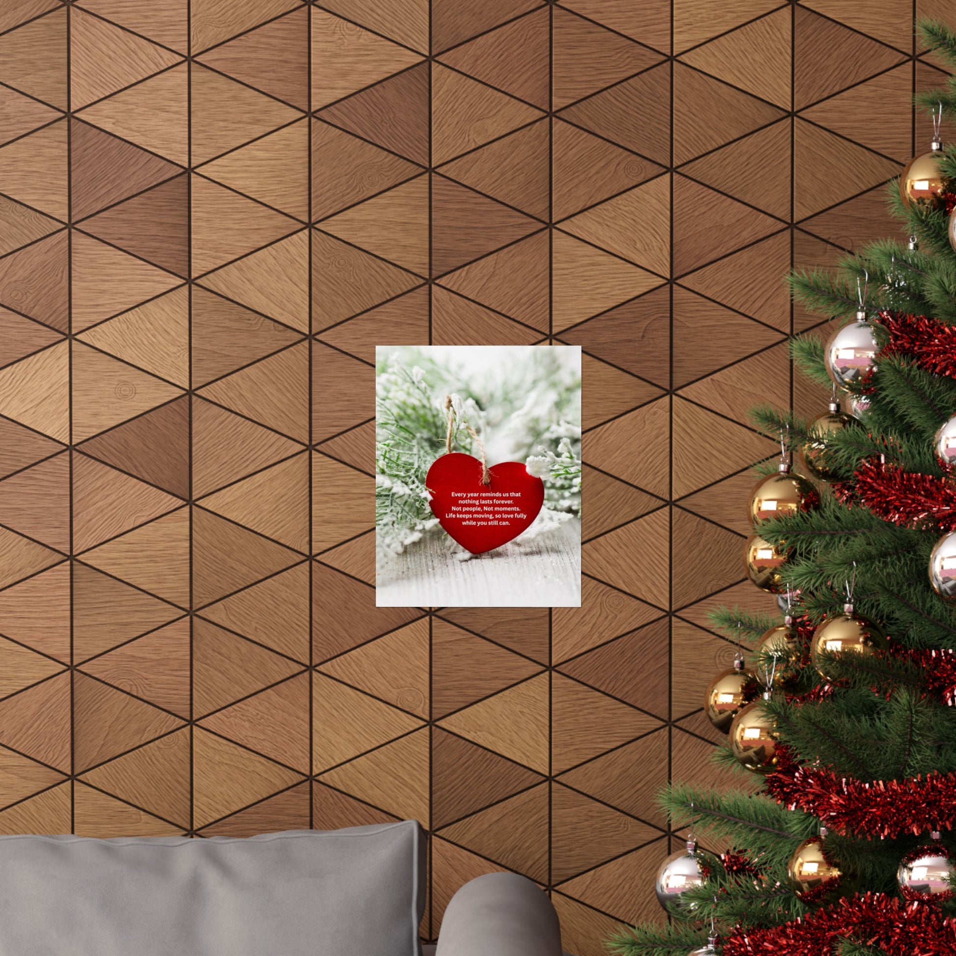 A softly lit winter scene printed on archival museum-grade paper — this matte vertical poster captures a quiet, sentimental moment. A red heart ornament hangs against frosted evergreen boughs, the simple text on its surface speaking to small, treasured moments. The muted matte finish absorbs glare and highlights the print’s delicate textures, making it feel like a photograph you can step into. Sized to fit a range of frames and printed with fade-resistant giclée inks, this poster brings a gentle, reflective touch to living rooms, bedrooms, or cozy nooks. Hung above a bedside table or leaned against a shelf, it creates a calm spot for remembering and slowing down during winter gatherings or reflective evenings at home.